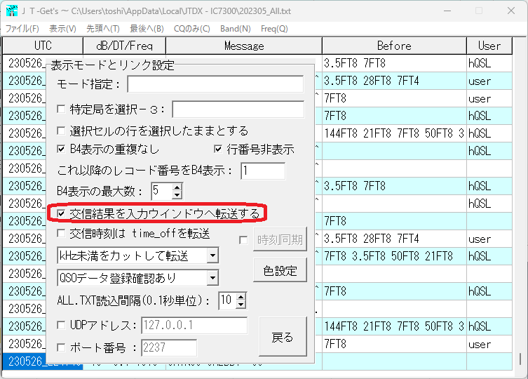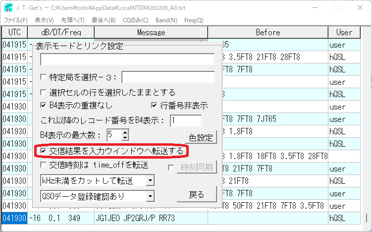 [交信結果を入力ウィンドウへ転送する] をチェックします。