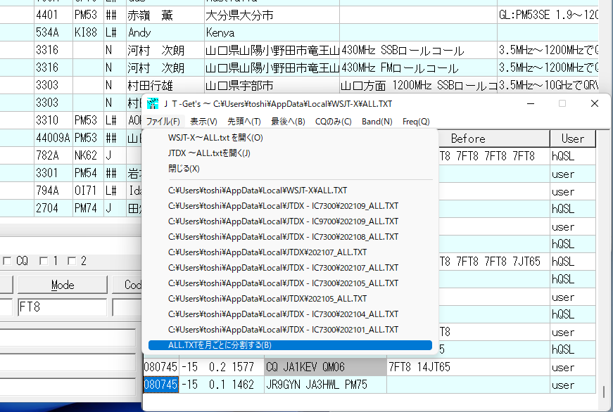 ALL.TXT分割機能はJT-Get'sの[ファイル]の中にあります。実行するとWSJT-XのALL.TXTが月毎に分割されます。