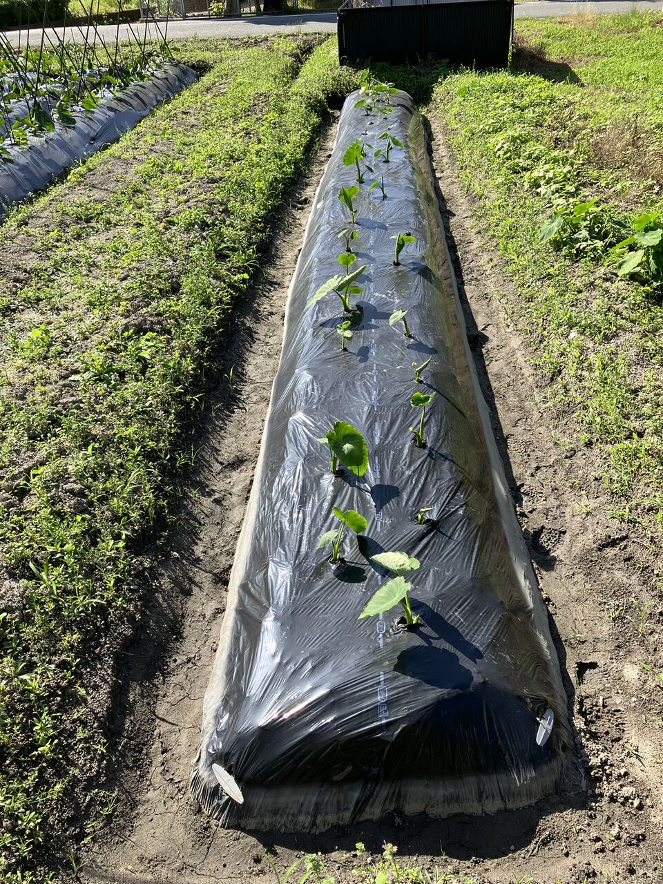 晴れるとマルチシートが暑くなって、マルチシートに触れた葉が枯れるので藁を敷いておきました。藁はパイプで押さえておきました。