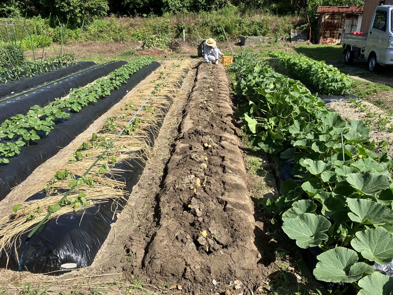 続いてジャガイモ掘りをやりました。株を切ってマルチを剥がして、スコップで起こしてから手で収穫します。家内に手伝ってもらいました。