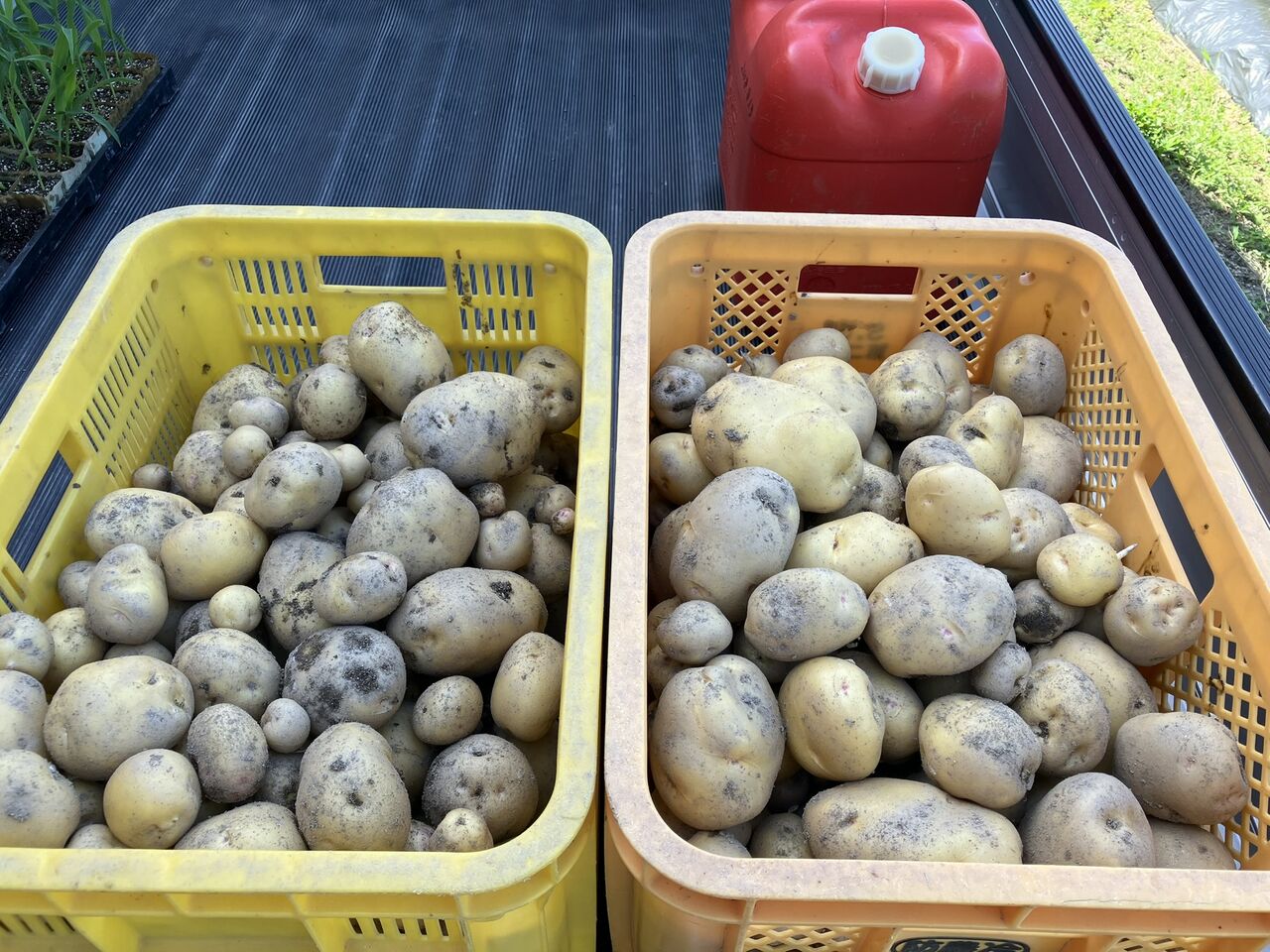 昨年は7月1日に春ジャガイモの収穫をしましたが、大きなものが多くてコンテナ2杯半ありました。今年は早めに収穫したので普通サイズが多いです。