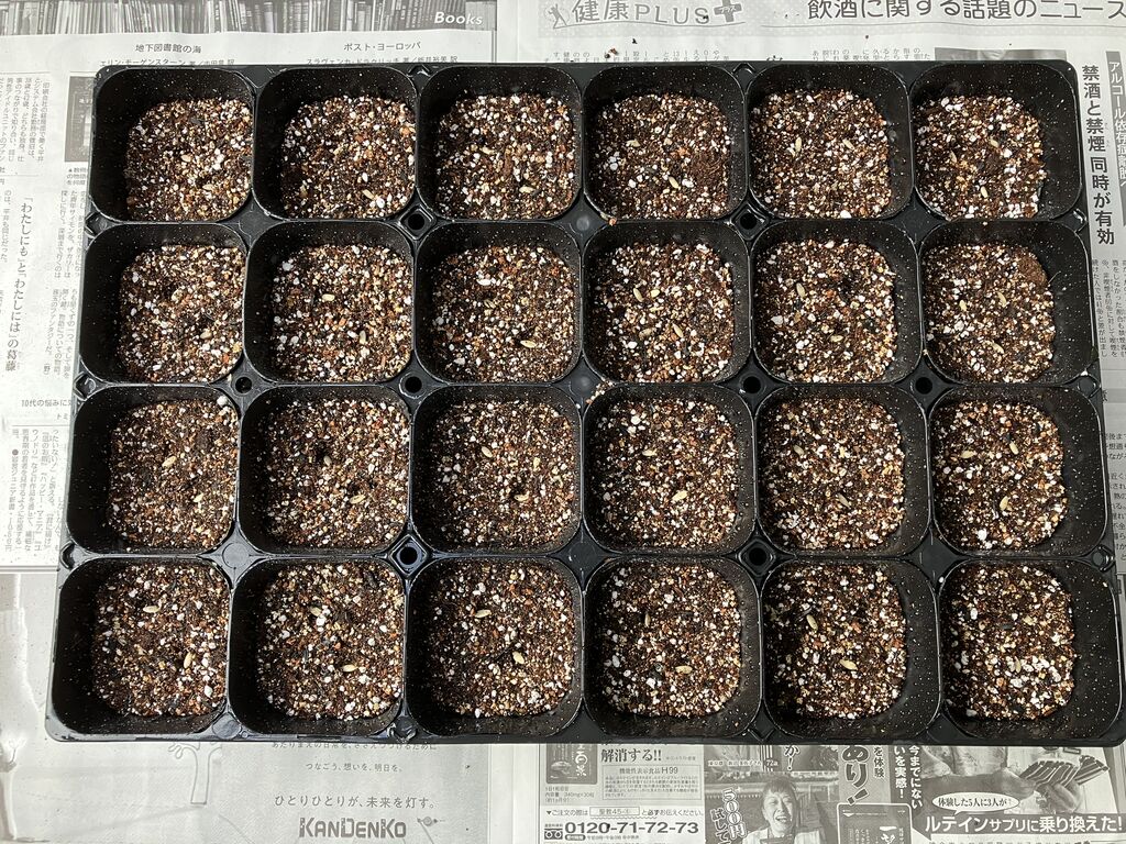 6月2日に2回目のキュウリ苗の種蒔きをしました。5月初めに植えるキュウリは苗を買っていますが、2回目は暖かい時期に育てるので自分で作っています。