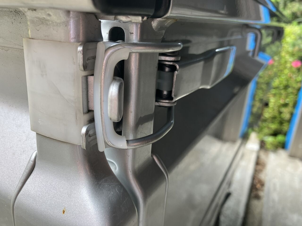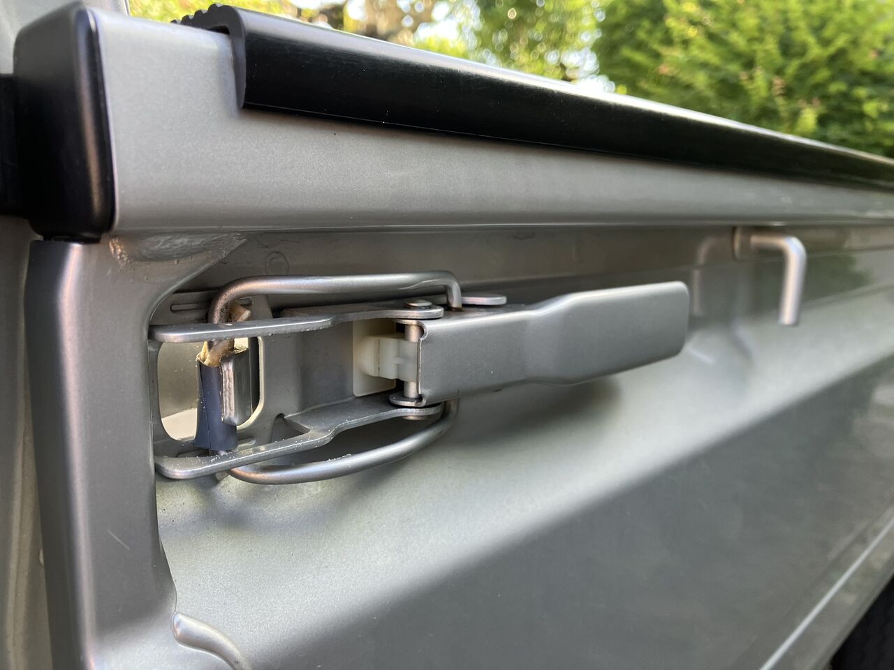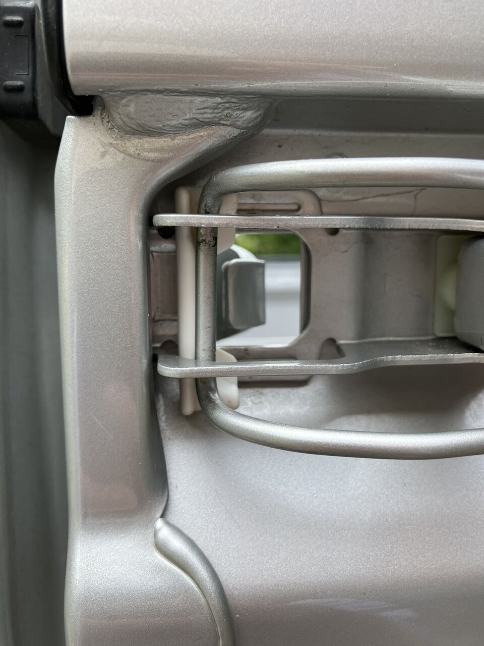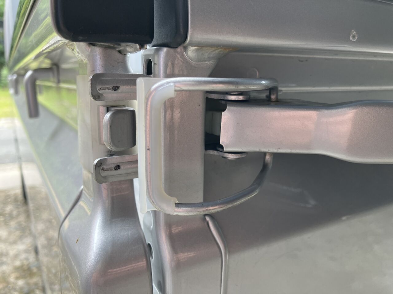調べるとサイドゲートをロックするフック部分のプラスチックが劣化しているせいで音が出ているようです。