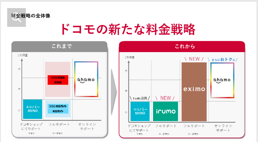 ニュースを見ると、同時にドコモから新料金プラン「irumo」「eximo」発表されています。