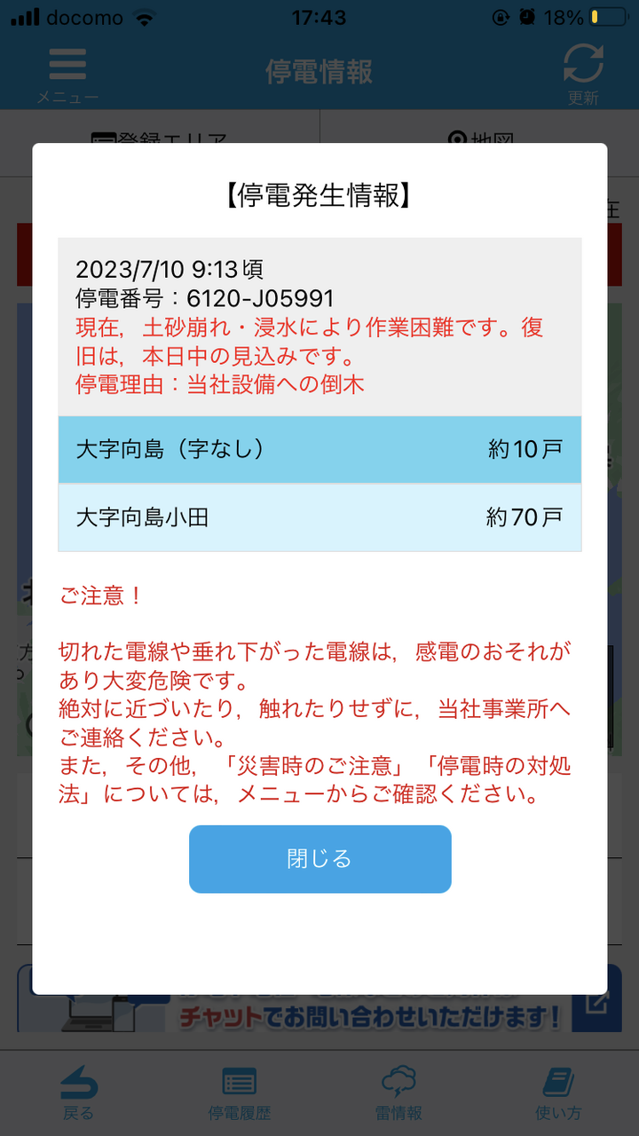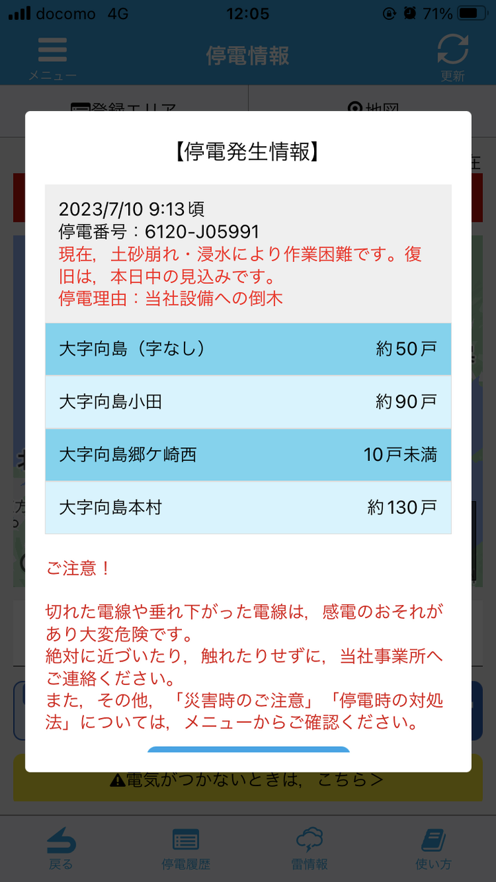 その後、友達から電話で「原因は小田地区に通じる道路でがけ崩れが起きて電柱が倒れたため」と教えてもらいました。