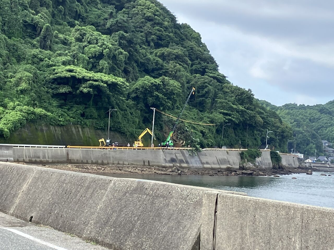 60年近く前の子供の頃の話ですが、この道は現在のようにコンクリートの法面では無くて、よく崩れていました。1か月以上通れない事があって、友達の家に遊びに行くのに、道路の下の海岸に作られた仮設通路を歩いて行った覚えがあります。