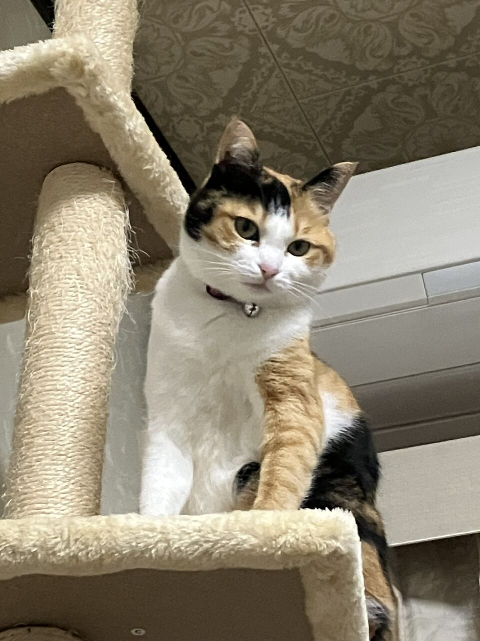 キャットタワーにはあまり登らなくなりましたが、気が向いたら登って見下ろしています。