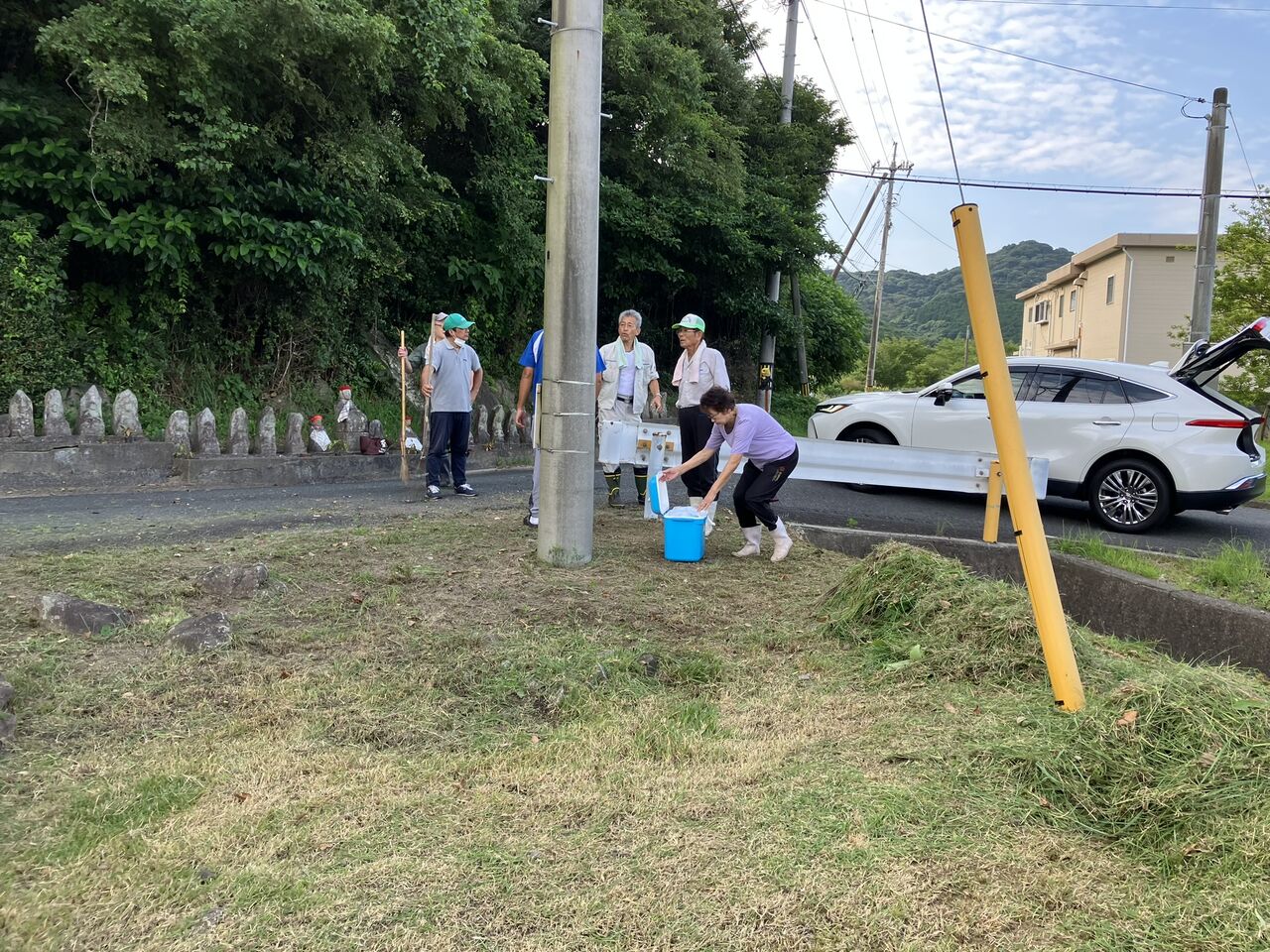 昨年は私も草刈機を持って行って草刈りをしましたが、今年は草刈機要員が多いそうで、私は草を集めて積む係をやりました。道具はガンゼキ、テミ、一輪車を軽トラに積んでいきました。