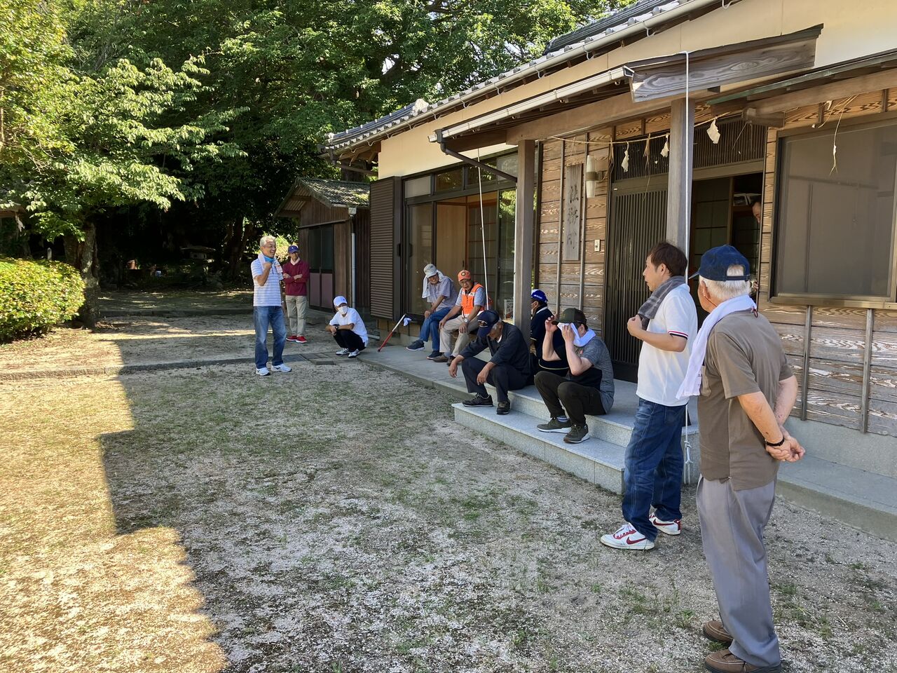 神事の後で一休みしました。以前のように小学生が歩くのではなく、大人が歩いて予定よりだいぶ早く着いたので時間調整をしました。