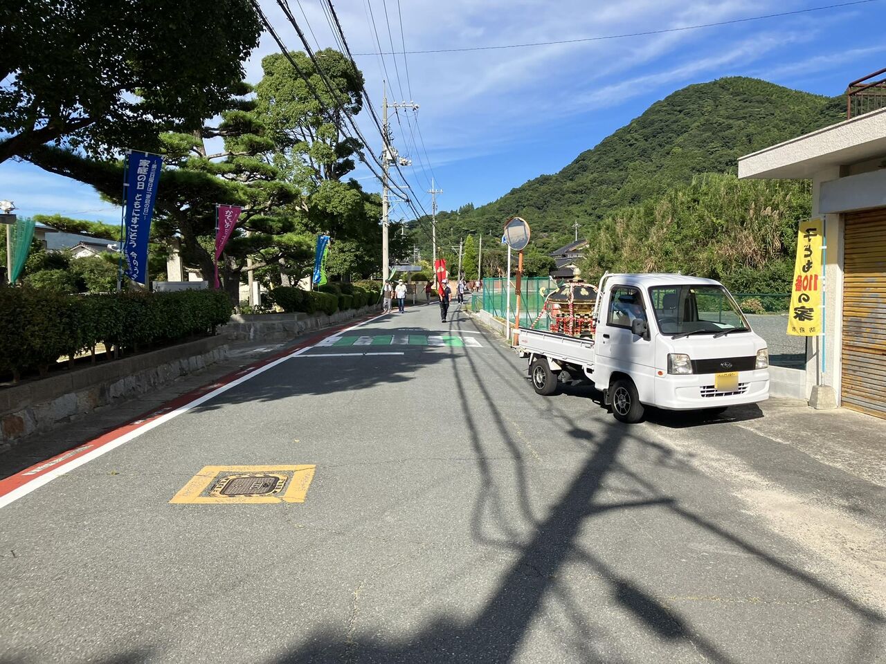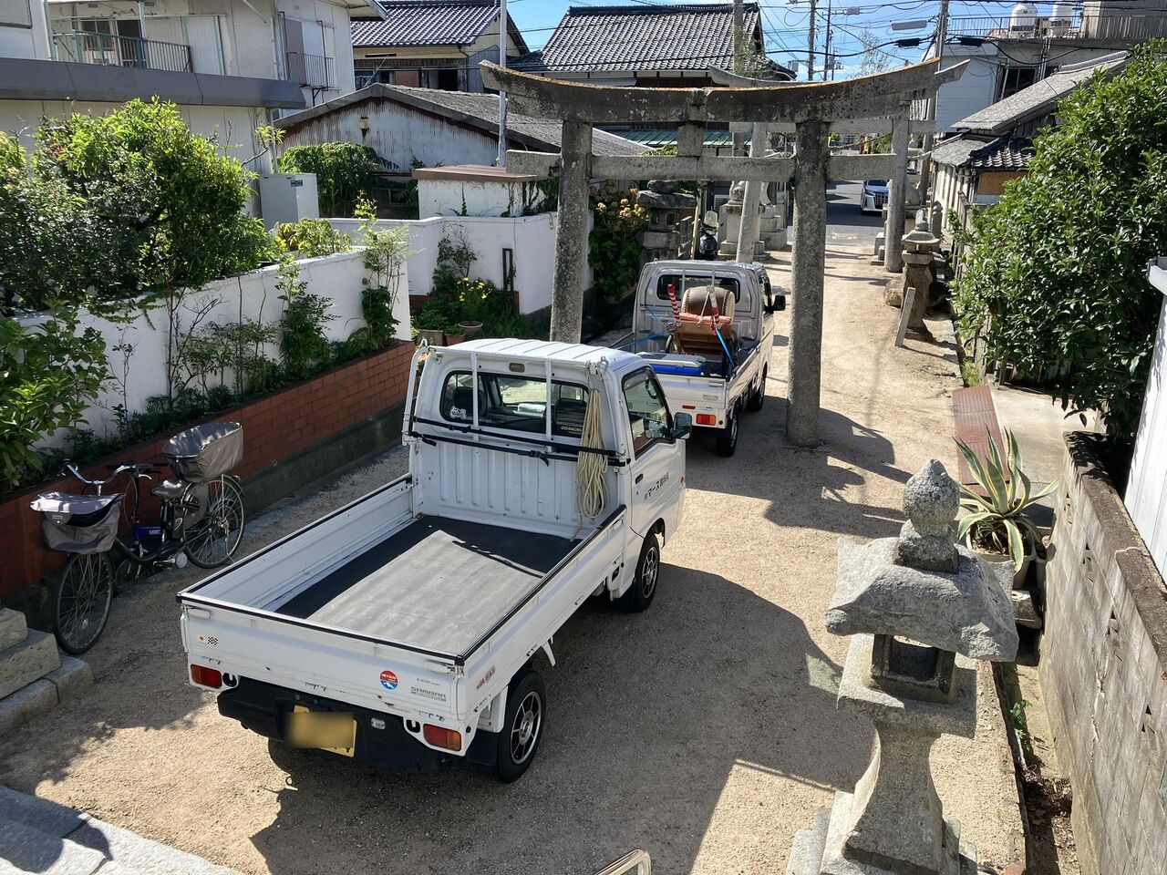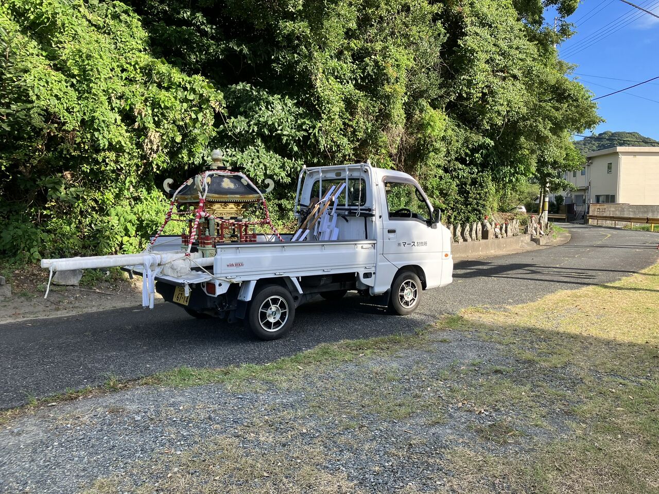 軽トラは2台で、前の車が太鼓、後ろがお神輿を積んで行きます。前の車は私の車です。