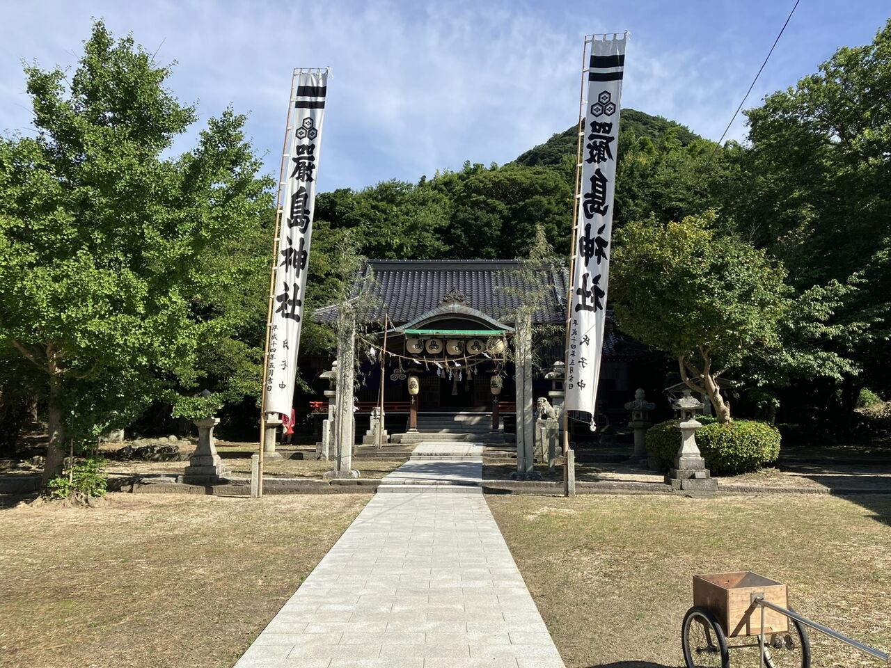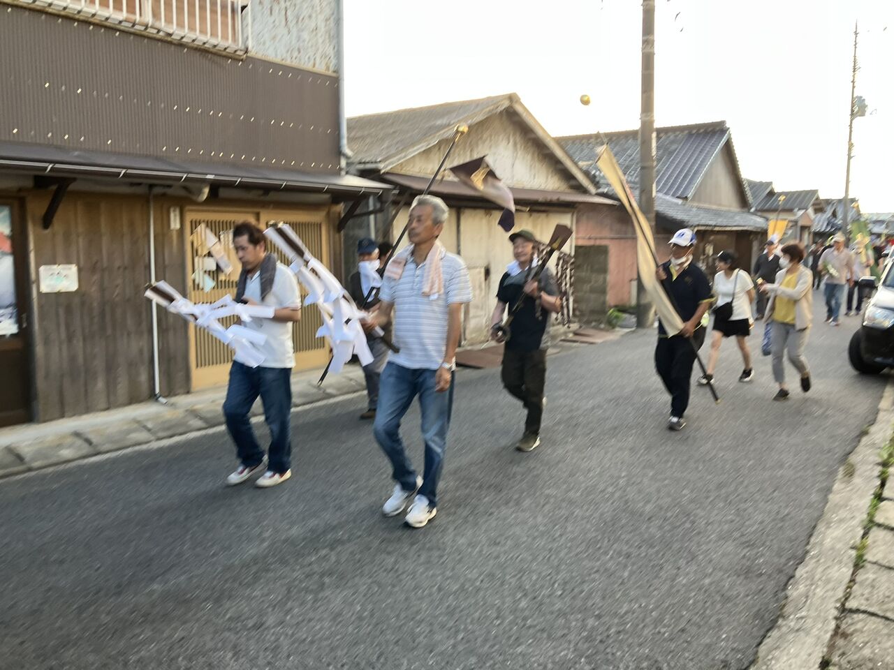 以前は子供がお神輿を曳いて島の東側の厳島神社から西側の小田港まで行っていたのですが、今回から軽トラにお神輿を載せて総代会の大人(爺さんたち)の行列がついて歩く形式になりました。(^^;
