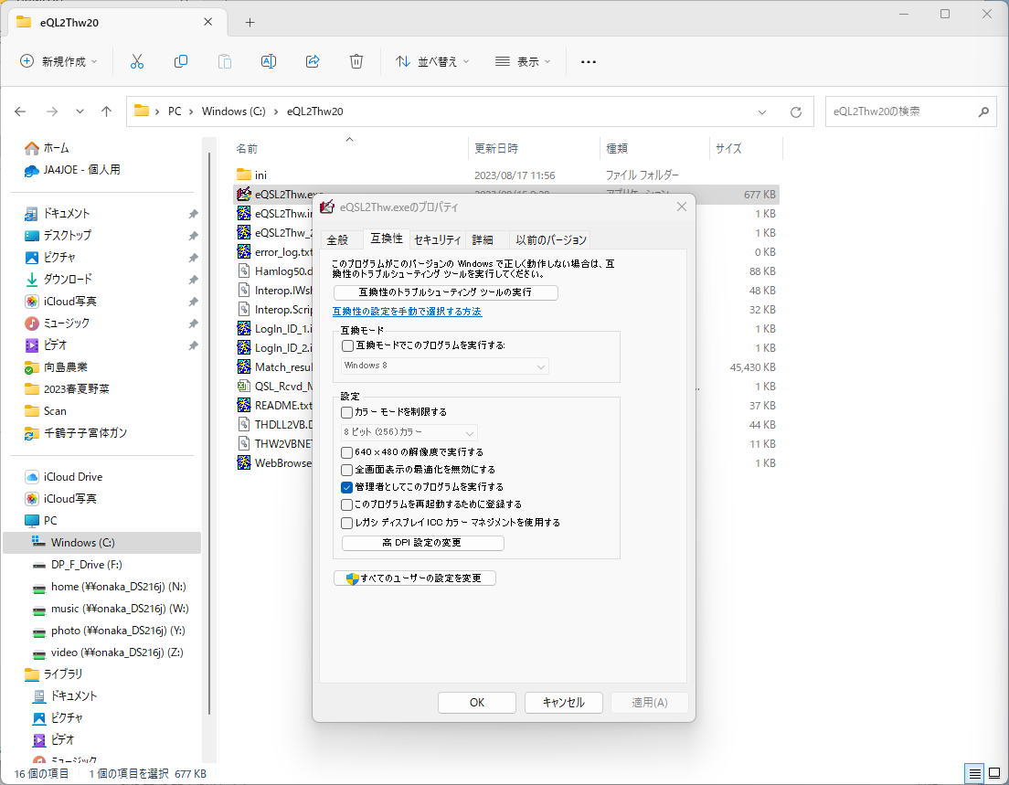 私の場合、HAMLOGの Hamlog.hdb をOneDriveのフォルダーに置いているので、新しいeQSL2Thw.exeのプロパティーを「管理者としてこのプログラムを実行する」に変更しました。(Hamlog.hdb をOneDriveのフォルダーに置いているとeQSL2Thwがうまく動かず、管理者として実行すると動きます。通常は必要ないと思います。)