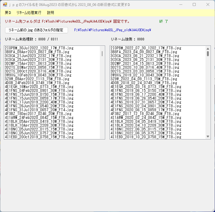 [リネーム前のjpgのあるフォルダの指定] に旧フォルダーのeQSL_JPeg_oldにあるjpgフォルダーを指定して、[リネーム処理実行] を行います。