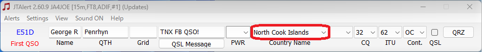 最新の JTAlert 2.60.9 では E51D が South Cook Islands と表示されますが、Manage Callsign Overrides 機能で North Coook Islands に変更できるそうです。