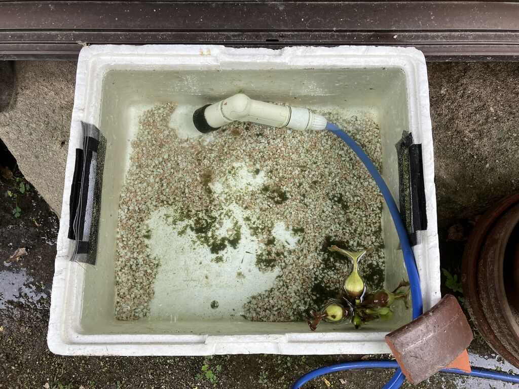 サイドに水換え用の穴を開けて網を張っておいて、井戸水を入れて穴から流して水を換えられるようにしました。