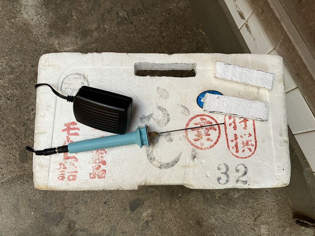 最初に箱のサイドに発泡スチロールカッターで長方形の穴を開けます。