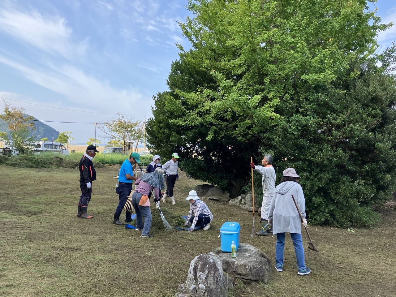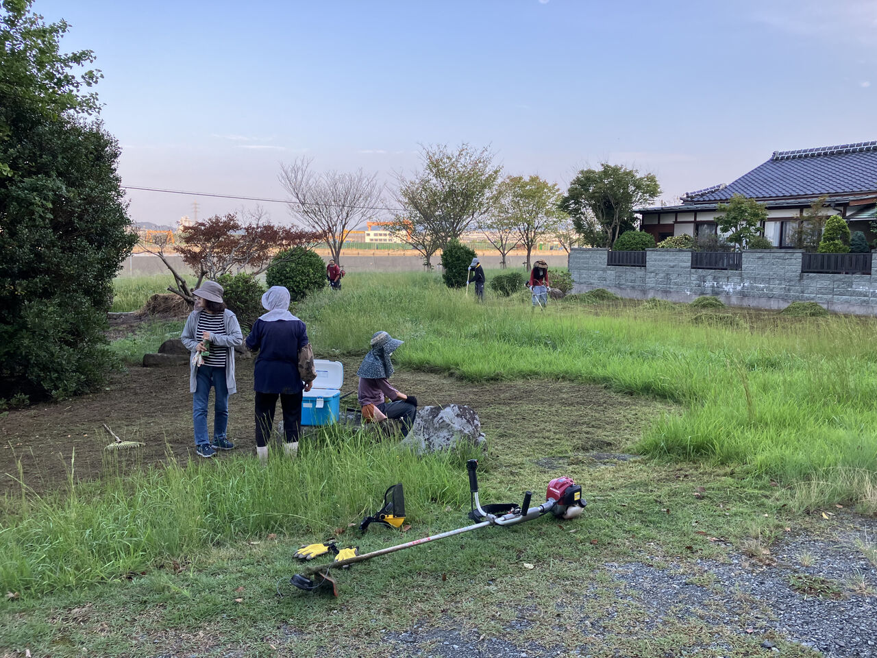 前回の十七夜祭の草刈りは草刈機を持ってきた人が多かったので私は草を片付ける係をやりましたが、今日は草刈機が少なかったので私も草刈りに参加しました。休憩中の写真です。