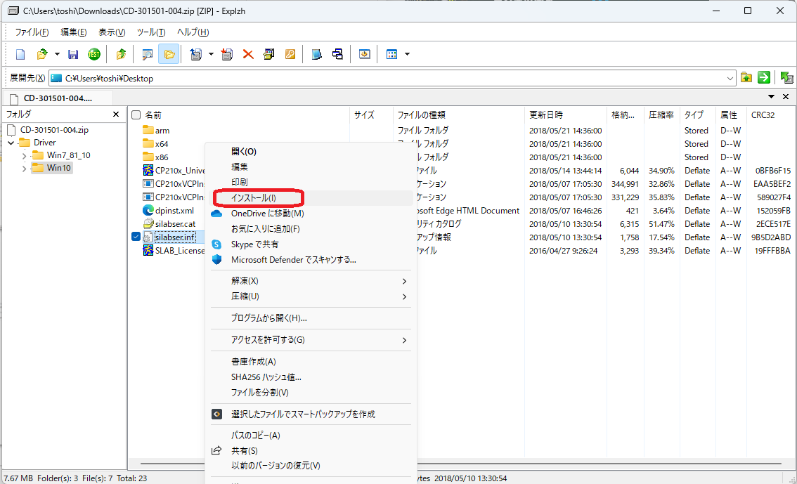 CD-301501-004.zipのWin10以下を解凍して、エクスプローラーでsilabser.infを選択して右クリックから[インストール]を実行したら無事にインストールできました。