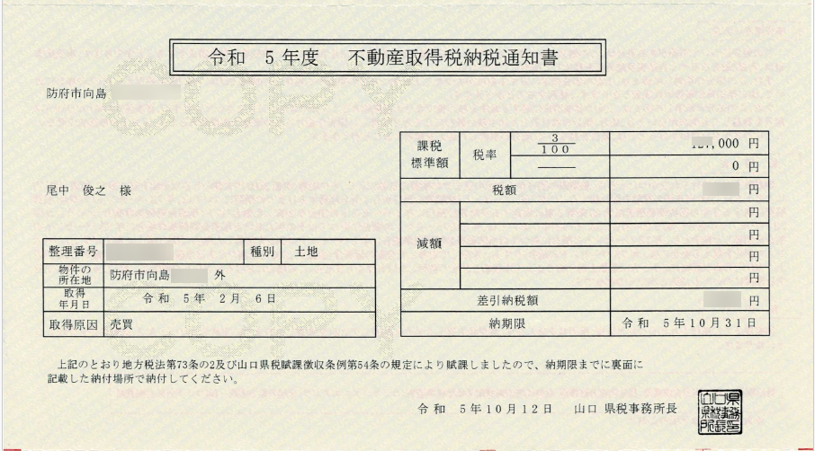 今年4月に借りていた農機倉庫の土地を購入して不動産登記手続きをしたので、その不動産所得税でした。