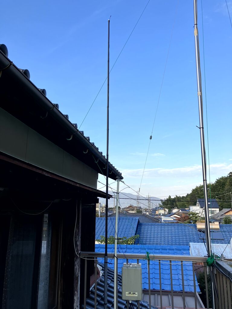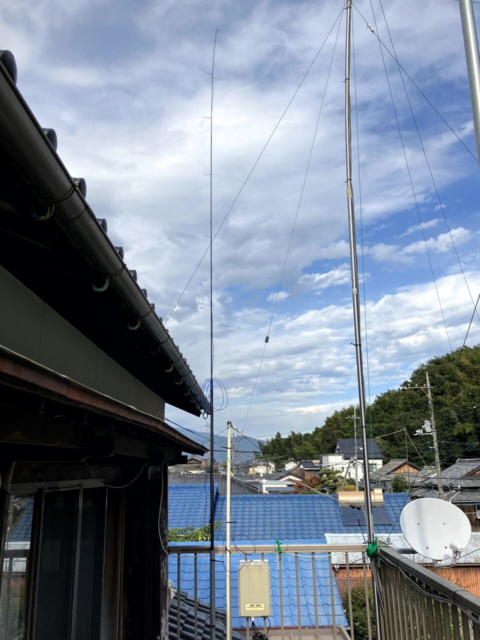 一昨日は「ハイバンド専用なら長いより短い方が良いのではないか」と思いついて、エレメントのIV線を21MHzの1/4波長の3.4mくらいの長さで立ててみました。