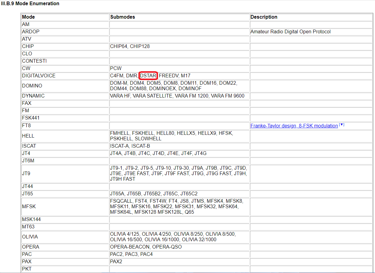 ADIF(Amateur Data Interchange Format) Version 3.1.4の仕様ではD-STARのMode定義は、Mode=DIGITALVOICE/Submode=DSTARになります。