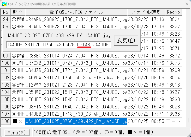 こういう場合、hQSLの照合のMenuから [電子QSLファイルをリネームして強制的に照合] でDVをDSTARに変更してModeを一致させています。
