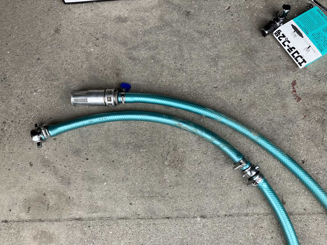 畑の水やりに使っているノズル付き18mmホースを接続するために、昨年作った25mm-18mm変換ホースを使います。