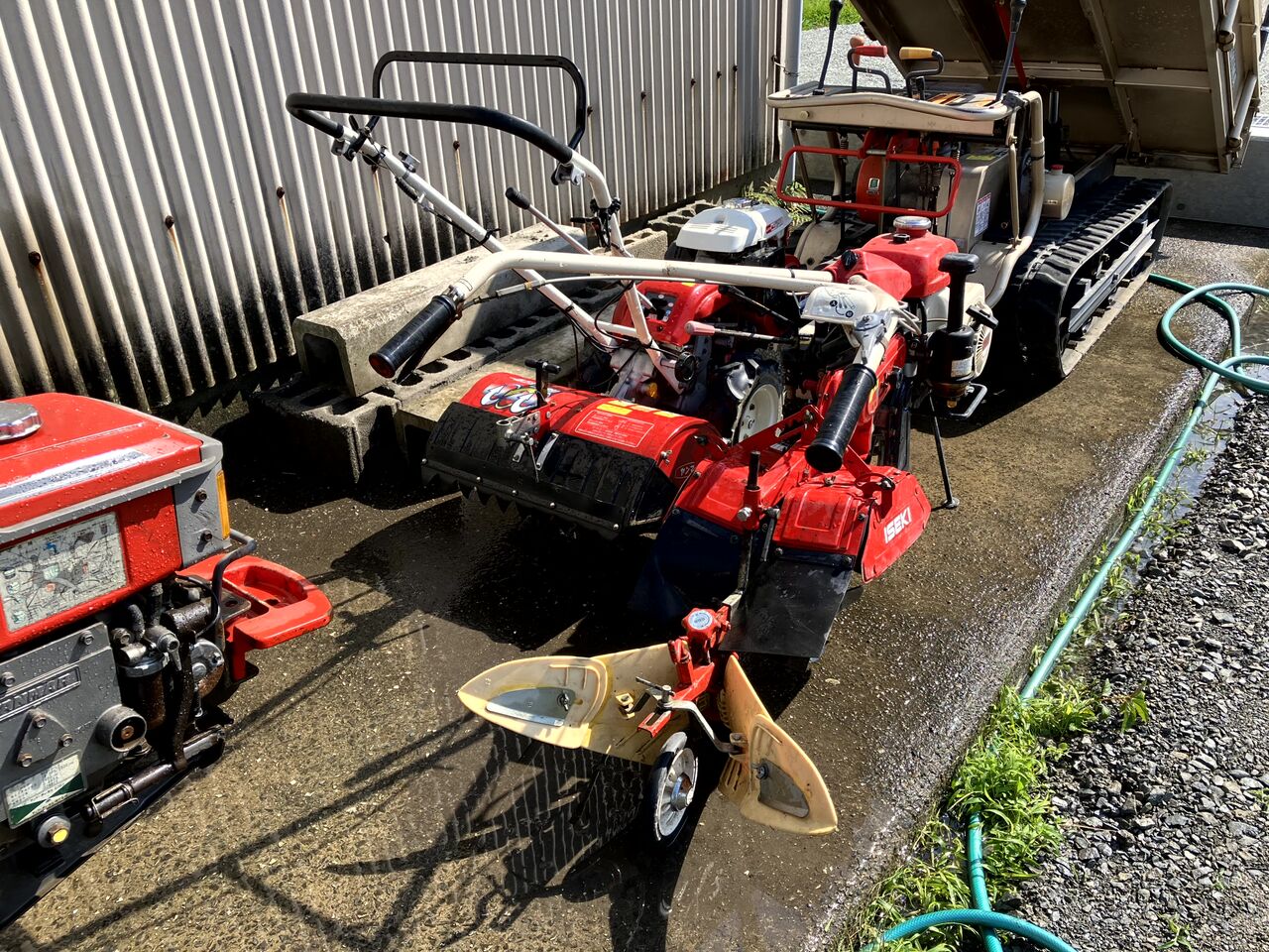 次は管理機2台を洗いました。左側のヤンマーポチは東側畑で使っているので、あまり汚れていませんでしたが、右側の一輪管理機は西側畑の湿った土を掘ったのでロータリー内に泥がこびり付いていました。