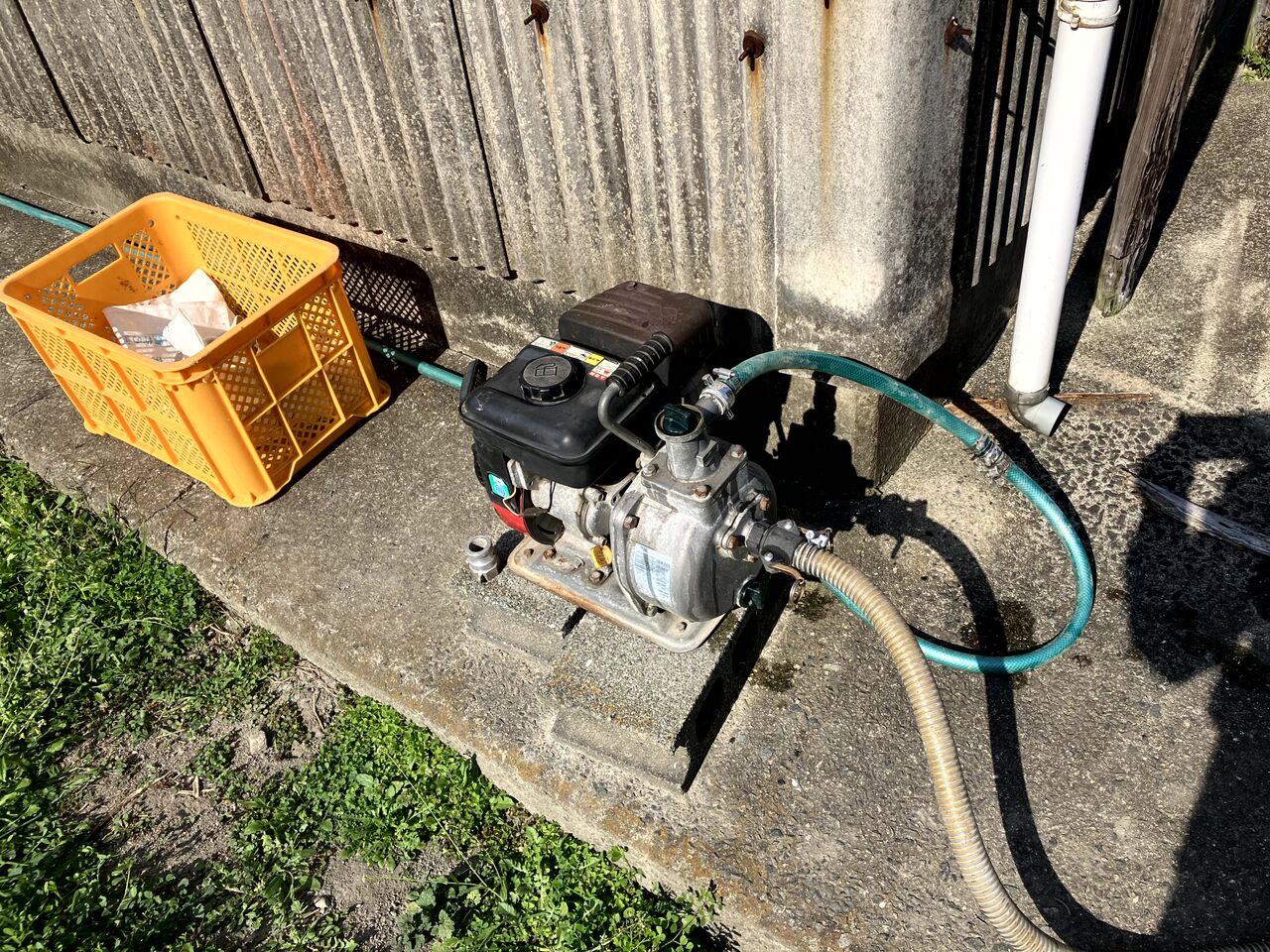 水は倉庫横の小川からエンジンポンプで汲み上げて洗車します。