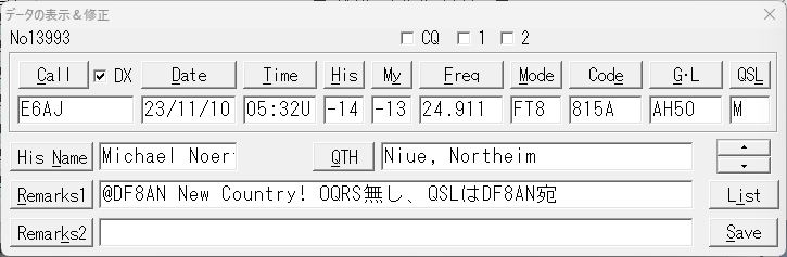久々で忘れてました。HAMLOGでQSL欄を「M」にしてRemarks1に「@DF8AN」と書けば良いのを思い出すのに、しばらく時間がかかりました。(笑)