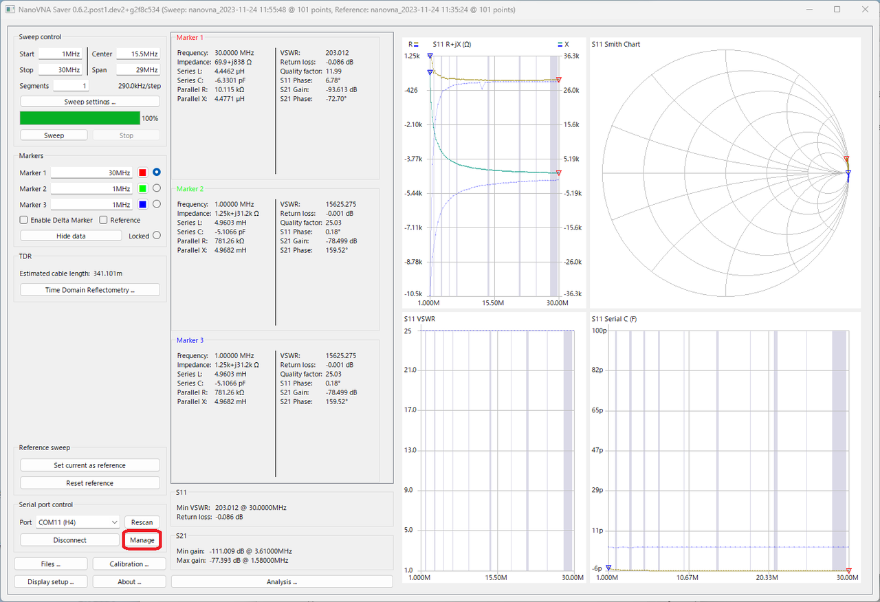 NanoVNA Saverで [Connect to device] でNanoVNAを接続してから、[Manage] ボタンからDevice Settingウィンドを開きます。