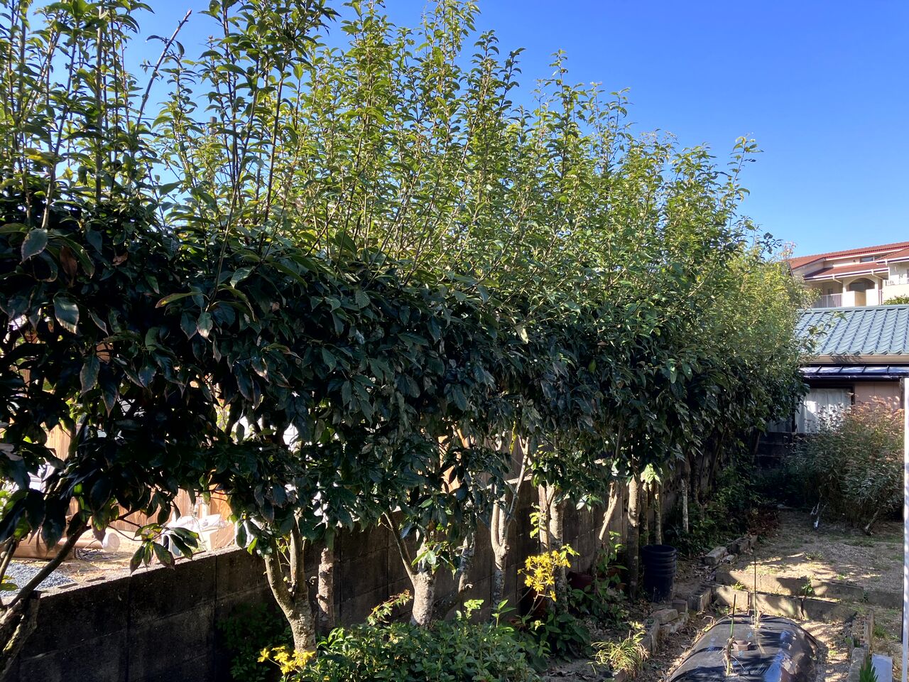 庭南西隅の立木(樹木名不明)です。電動ヘッジトリマーで剪定しました。