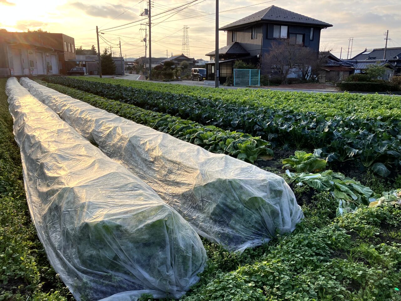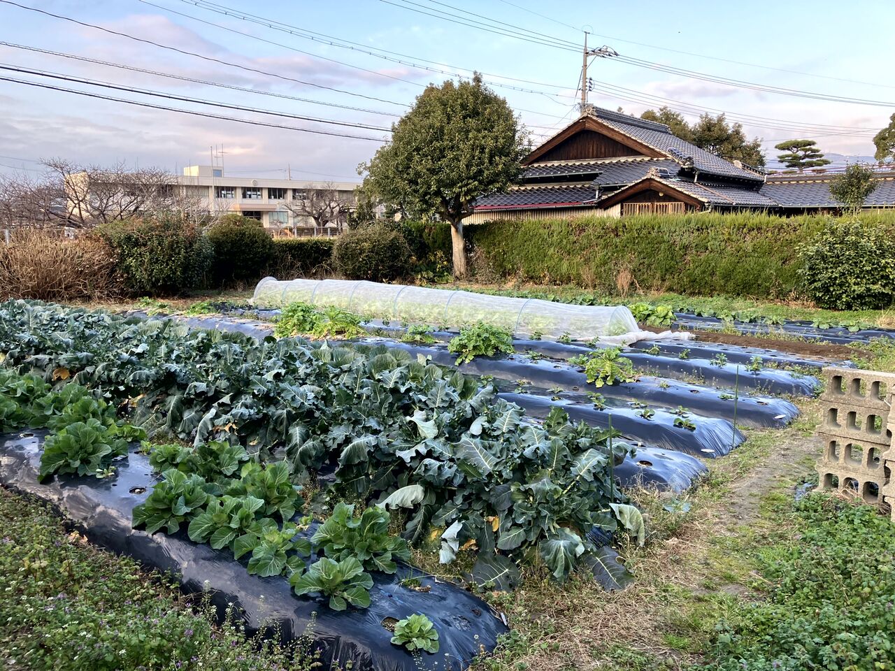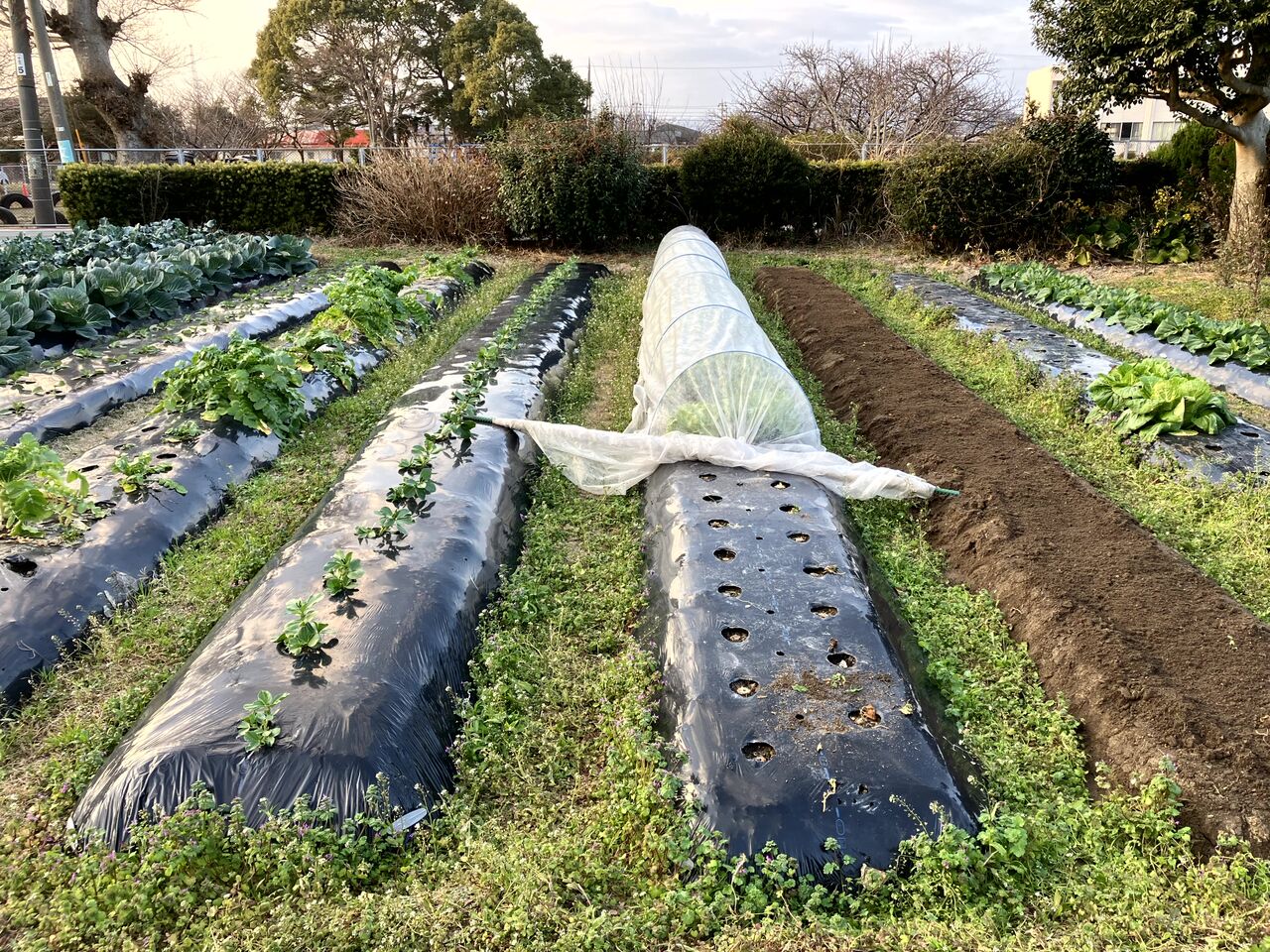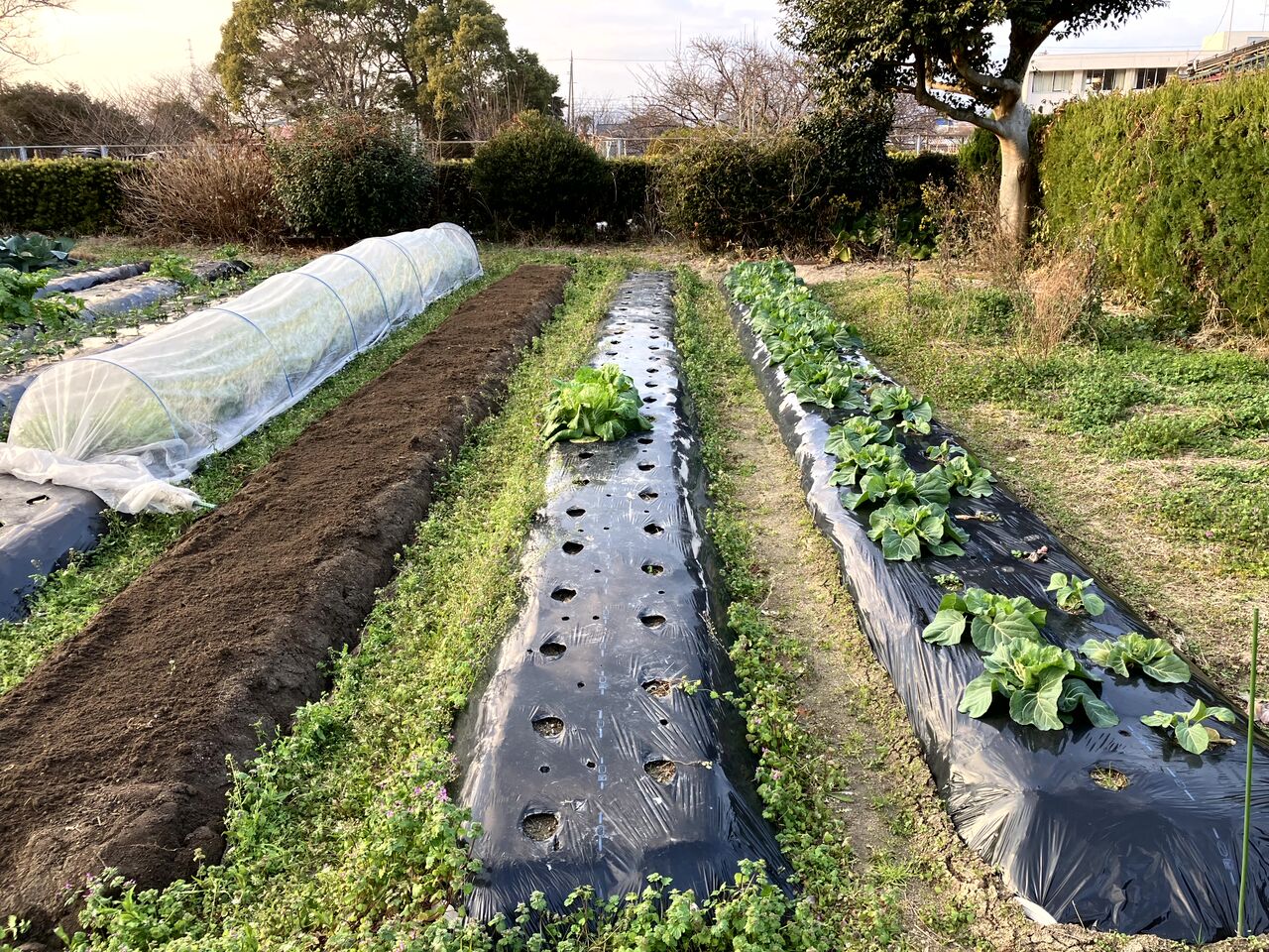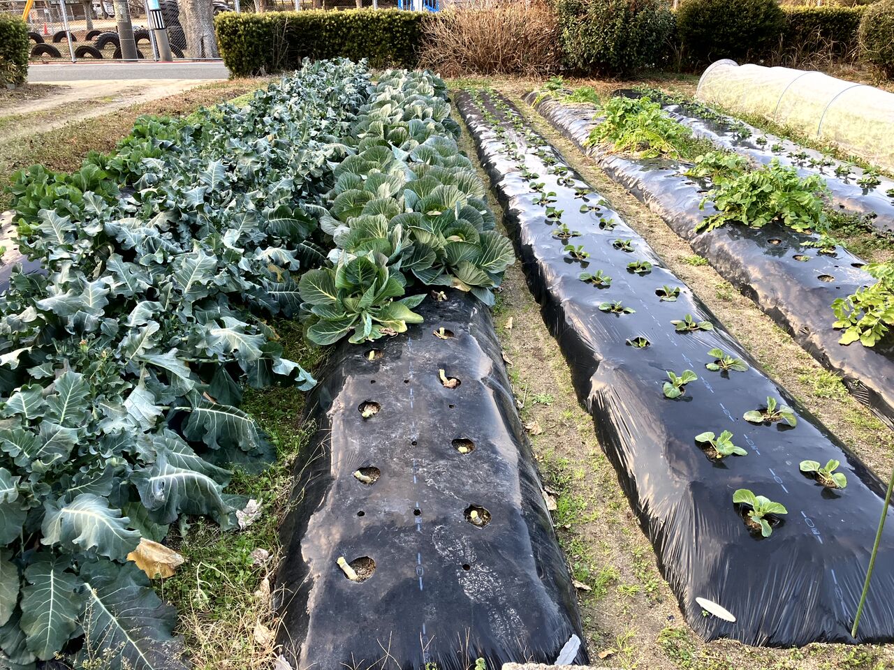 いちばん奥の春キャベツ(右側)はうまく育ってない苗が多いです。