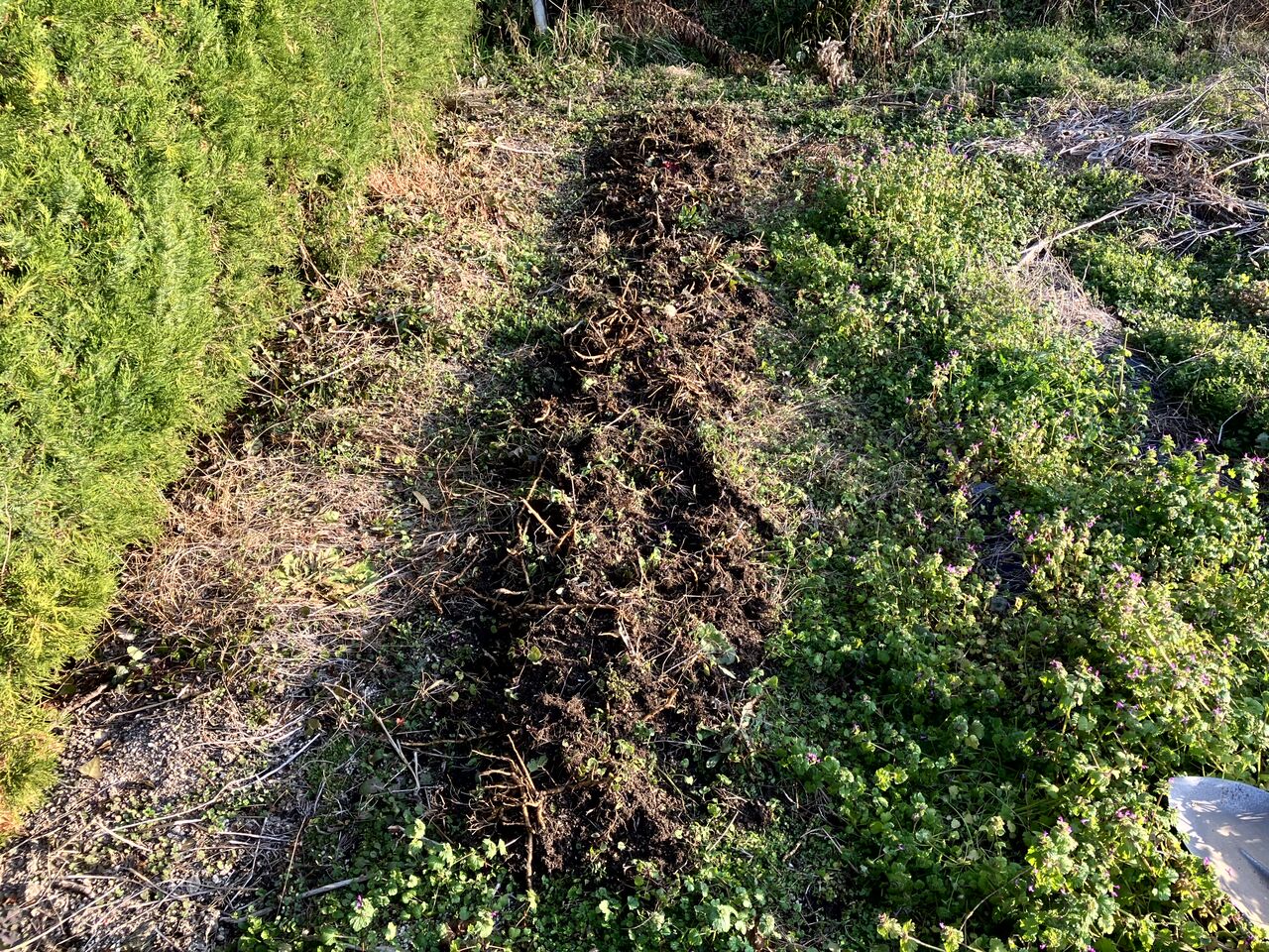 他に生垣の側に植えてあるミョウガを軽く掘り起こして、堆肥、苦土石灰を撒いておきました。