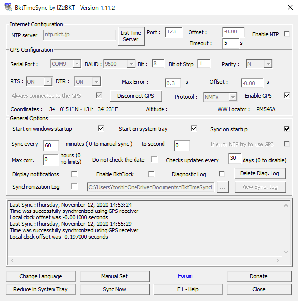 [GPSを切断] をクリックしてGPS同期を停止してから、シリアルポート=COM9、BAUD=9600にして [今すぐ同期] をクリックするとGPS同期を開始します。