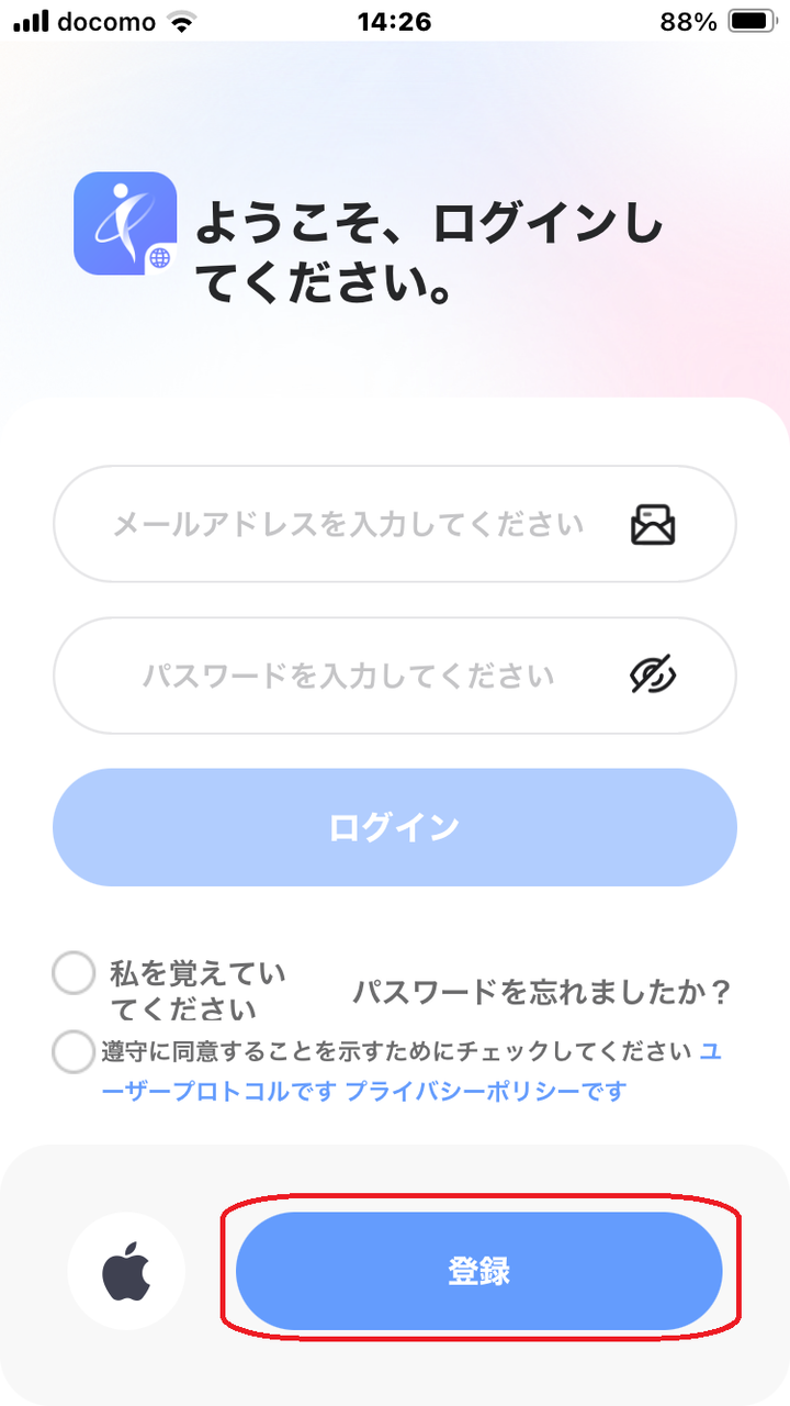 最初に表示されるログイン画面で [登録] を選んでユーザー登録をします。