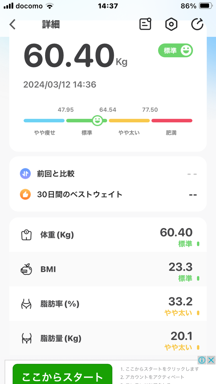 上記の測定値は洋服を着て測定したので値は正しくないです。(デブと思わないでね。(笑))