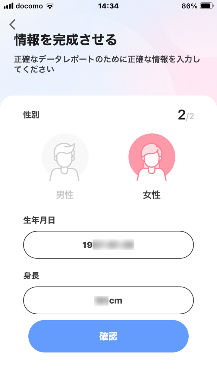 生年月日、身長、性別を設定して [確認] で進みます。