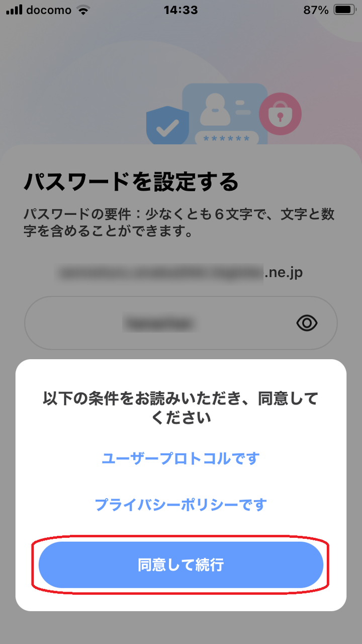メールアドレスとパスワードを設定して、[同意して続行] を選びます。