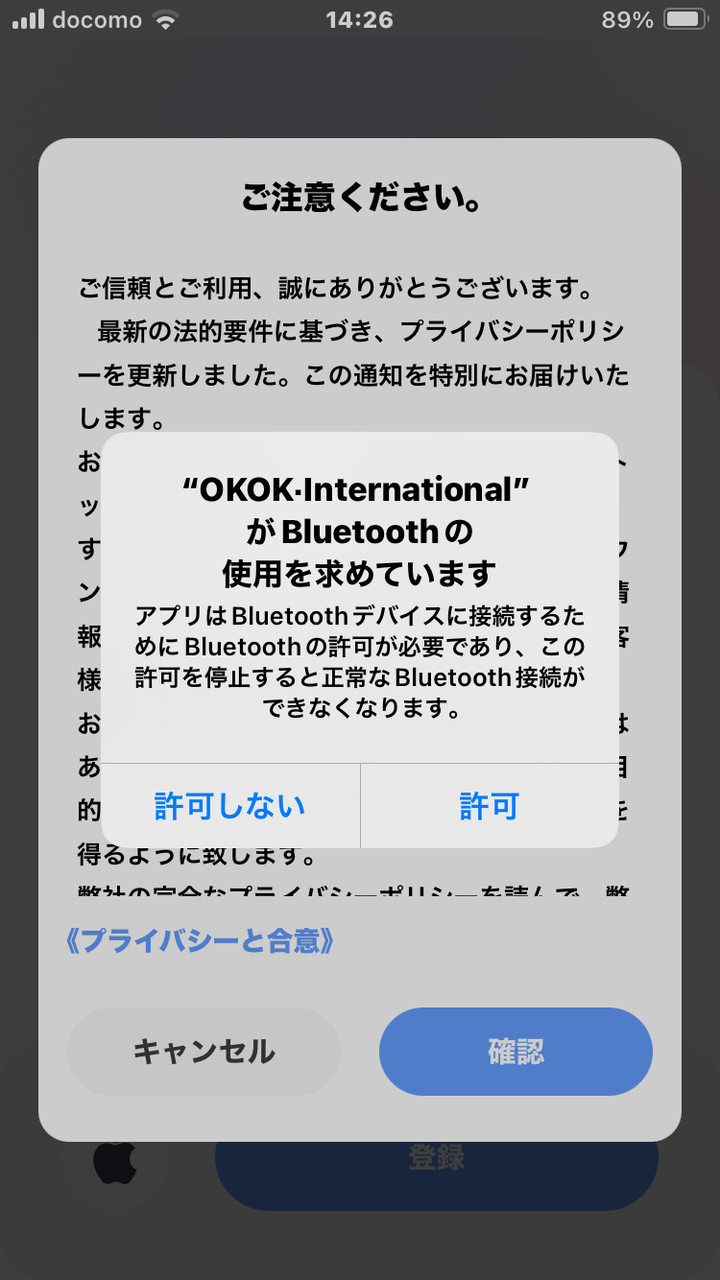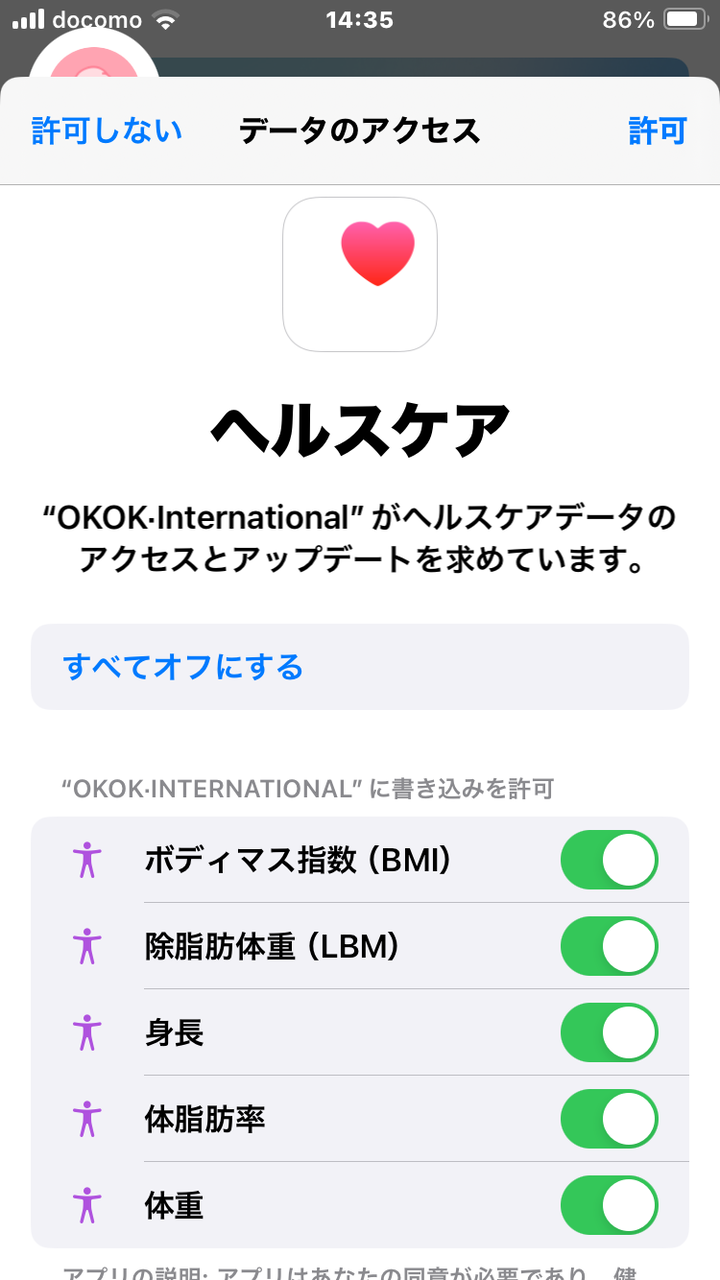 iPhoneのヘルスケアとの連携を許可します。ヘルスケアと連携させると測定値がヘルスケアにも記録されます。