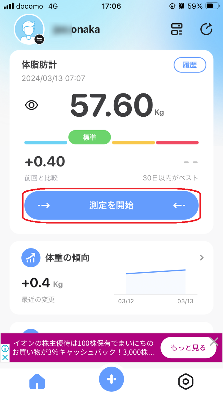 裸足で体組成計に乗って測定を開始します。