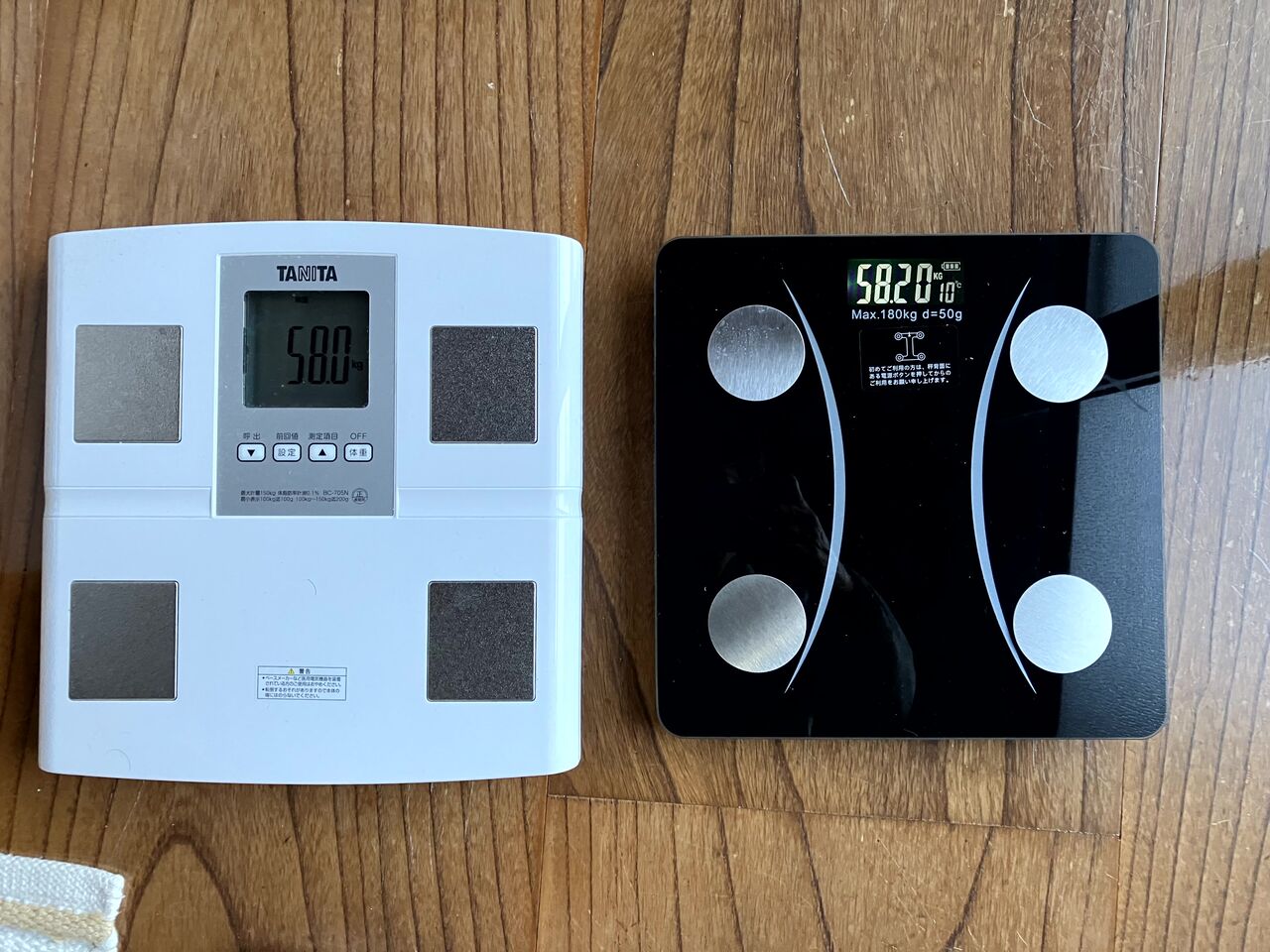 タニタと比べると体重が200g重く出るようです。(どちらもスマホを持って測りました。)