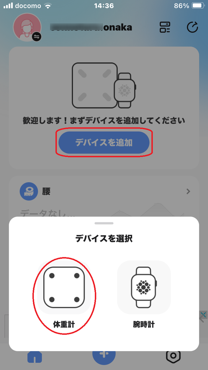 次の画面の [デバイスを追加] で体重計とBluetoothを接続します。