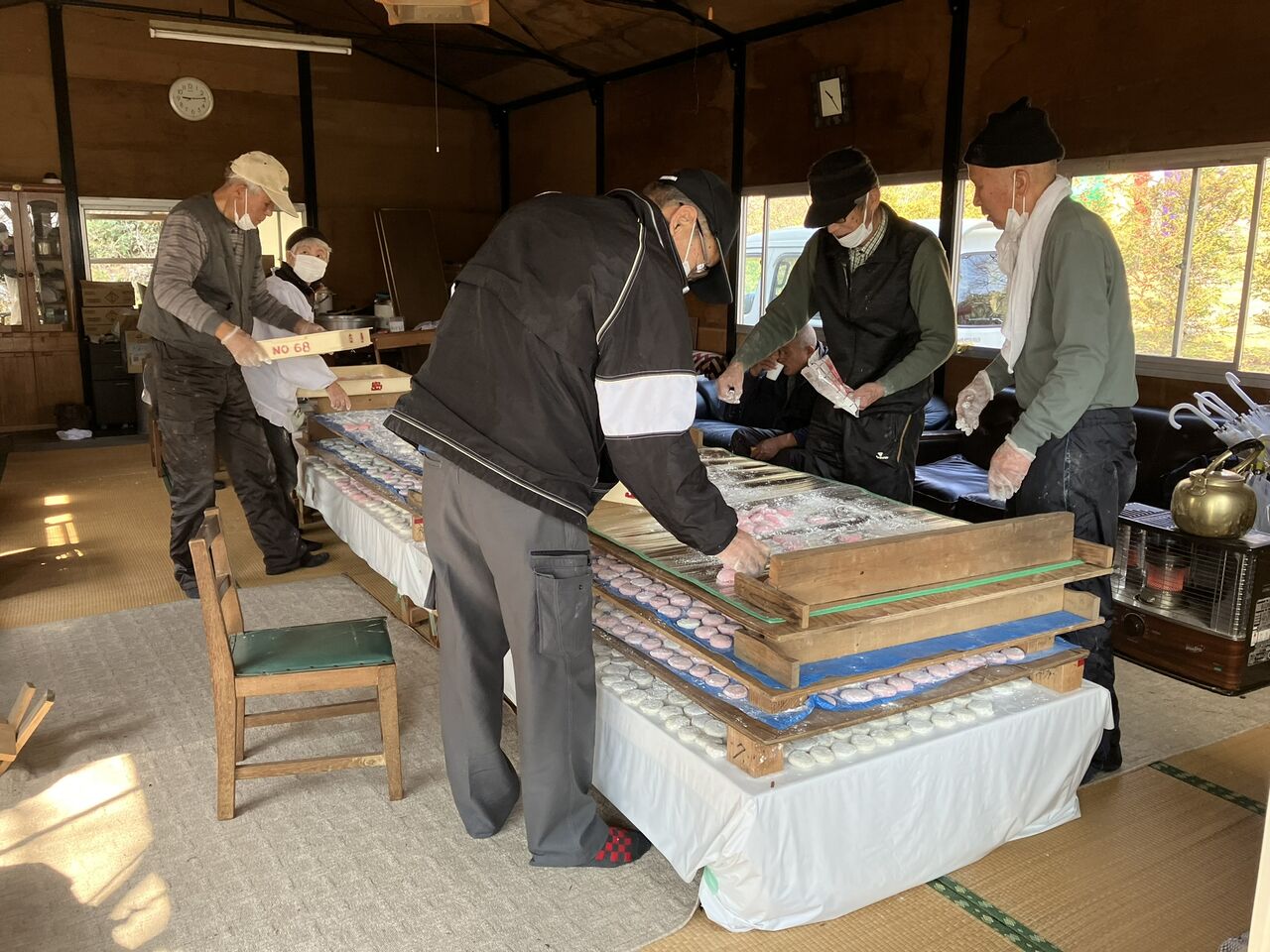 丸めた餅をコンパネを敷いて並べます。コンパネを積み上げて場所を取らないように工夫しています。