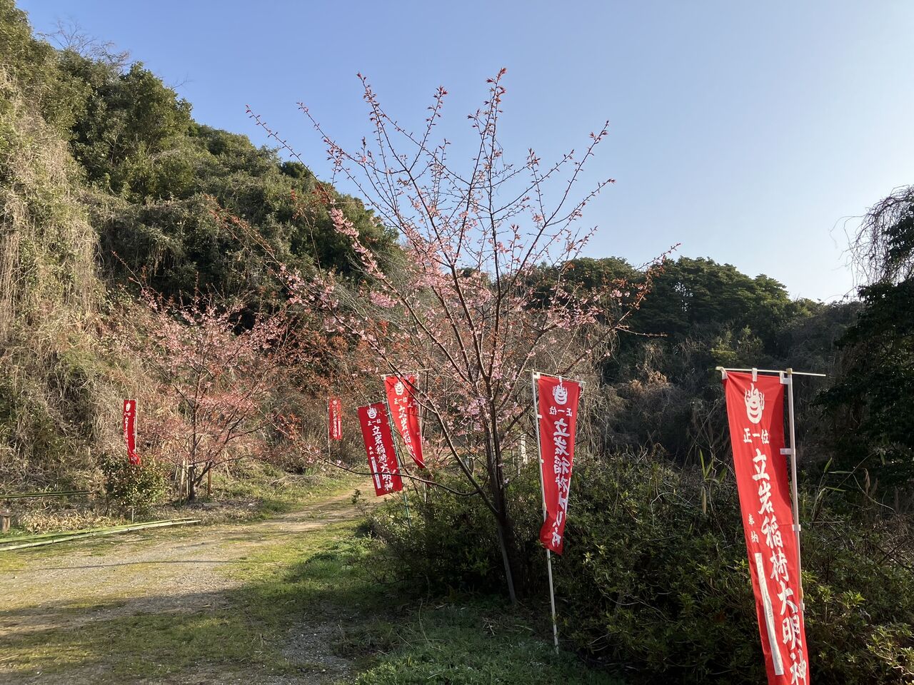 境内周辺に蓬莱桜の挿し木の桜が植えてありますが、島の南側は日当たりが良いので開花が早くて既に葉が生えだしていました。