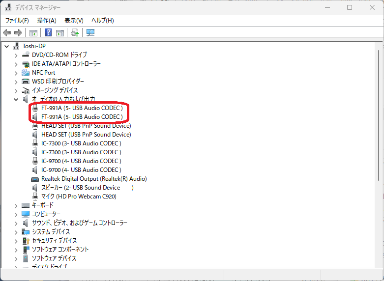 私の環境では (5-USB AUDIO CODEC) が追加されました。デバイス名をFT-991Aに変更しました。