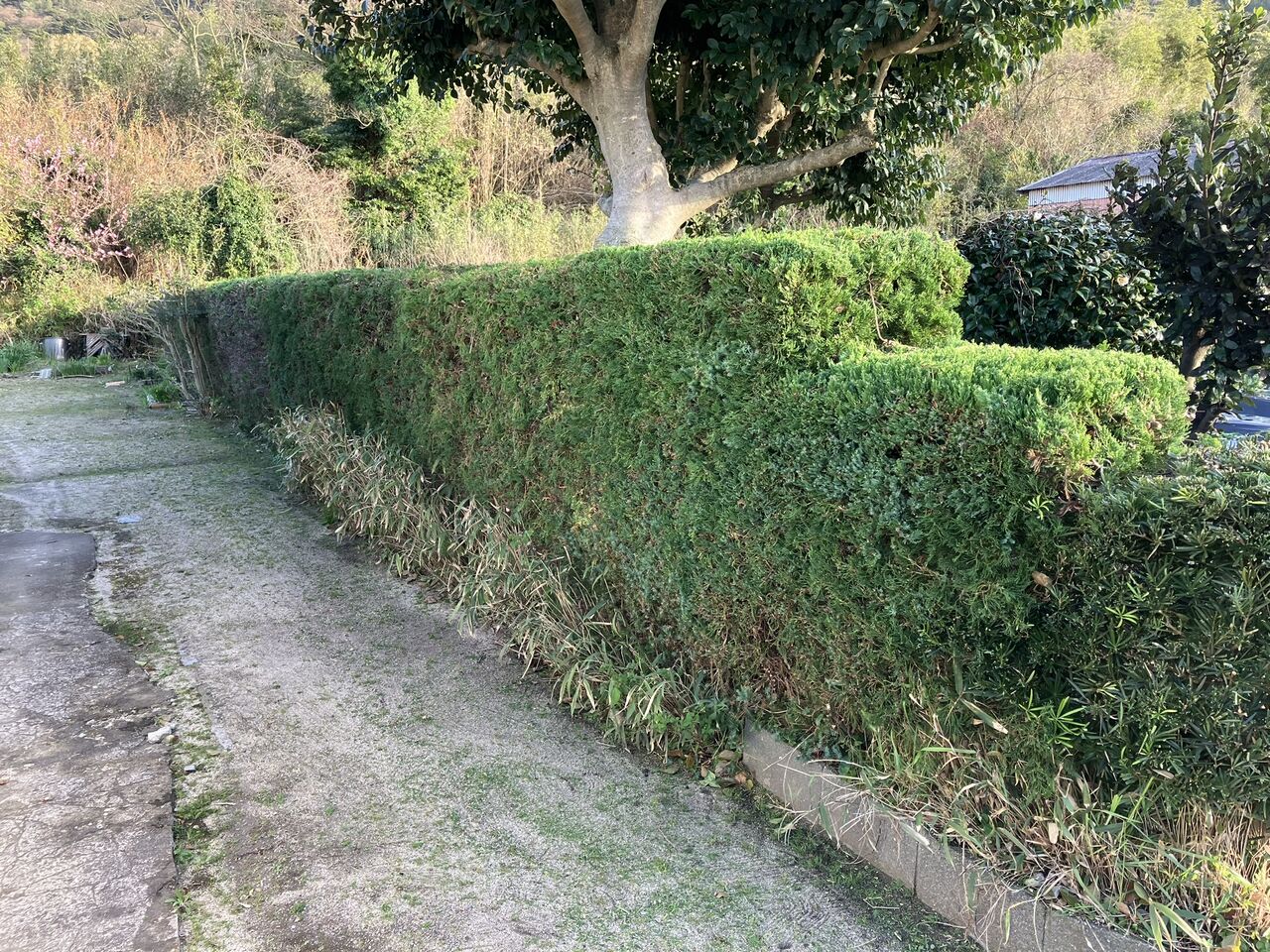 昨日午後は東側畑の東側のカイズカイブキの生垣の剪定をやりました。