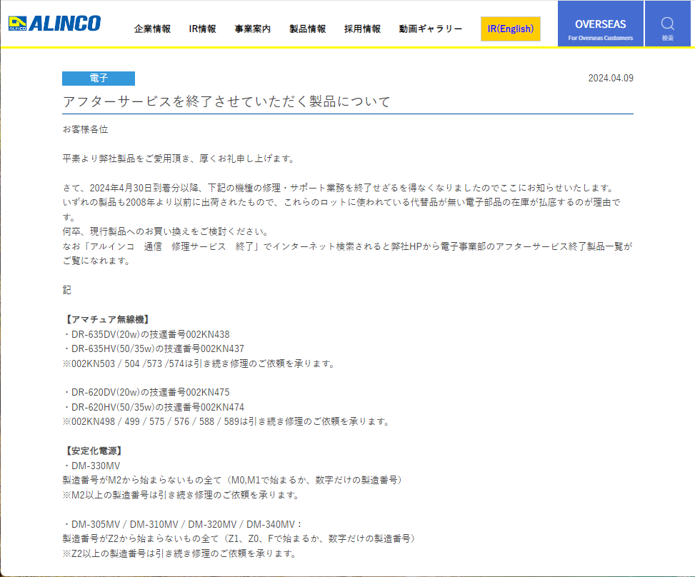 hamlif.jp を見ていたら、「何卒、現行製品へのお買い換えをご検討ください」と呼び掛け>アルインコ、「アフターサービスを終了させていただく製品について」を告知 という記事が目につきました。
