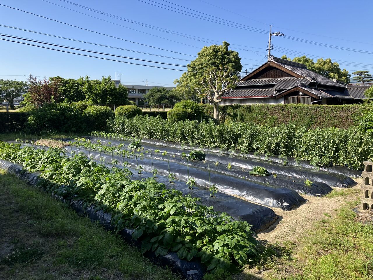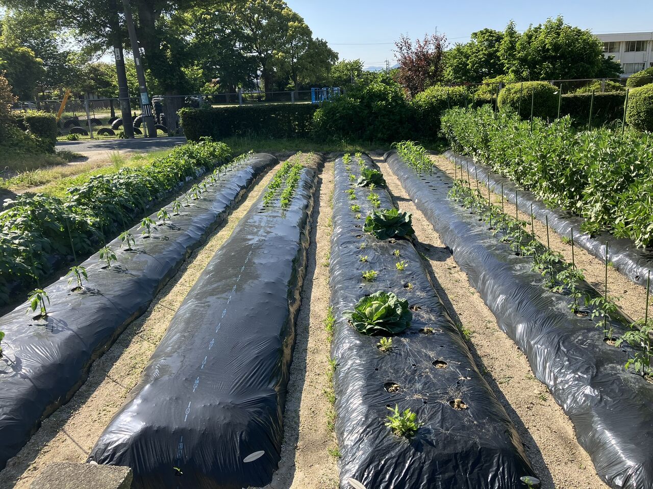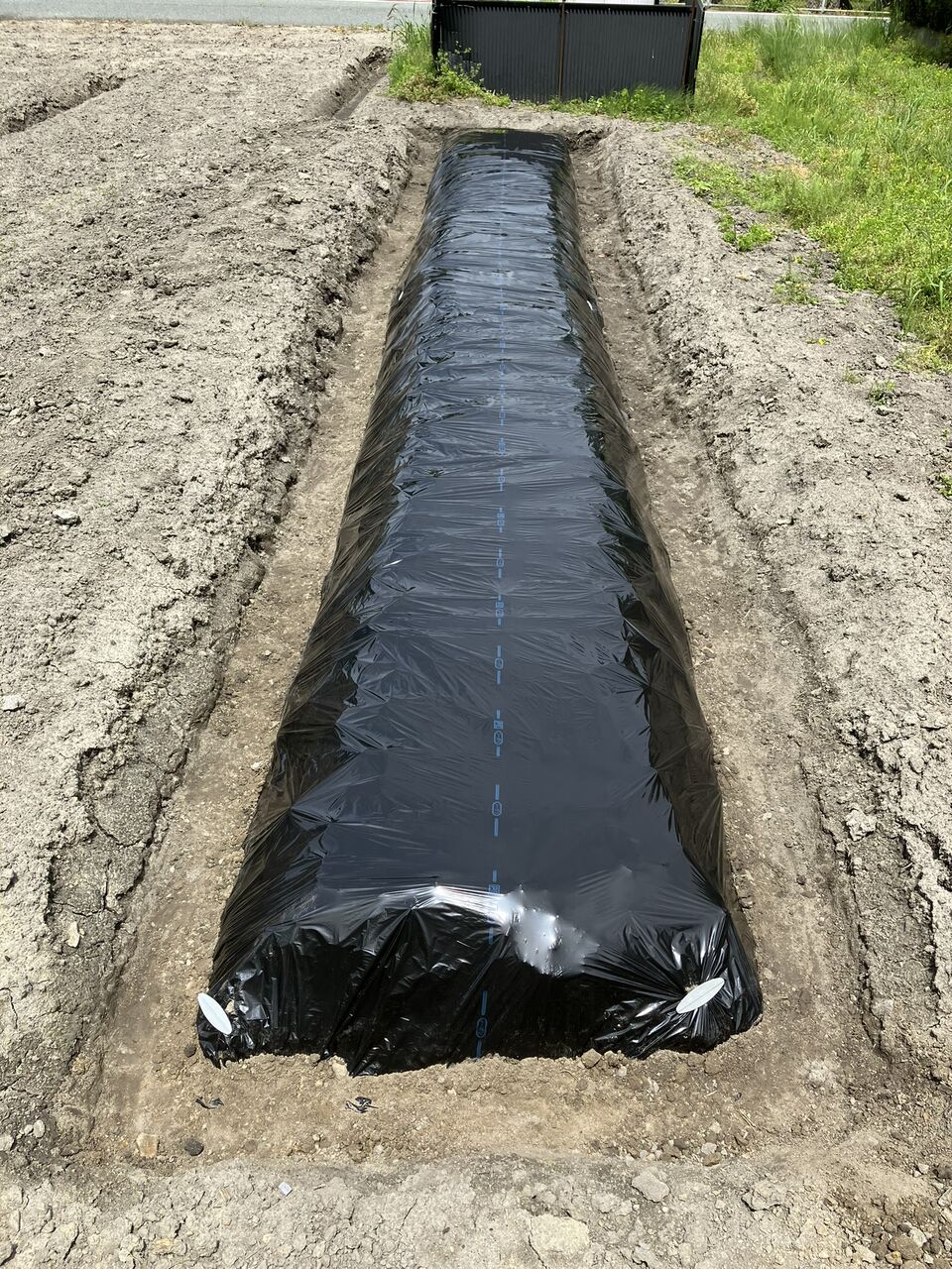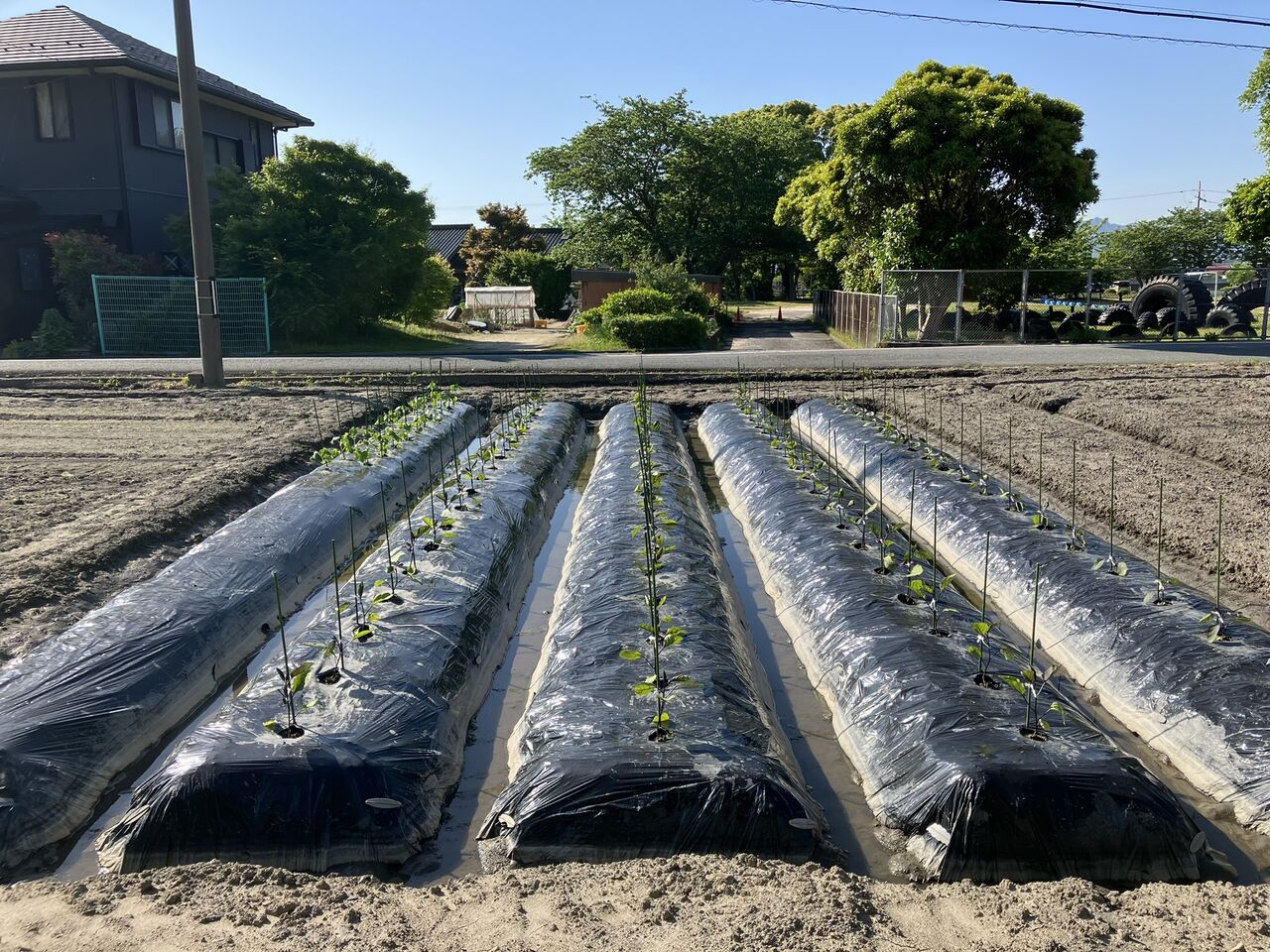 キュウリ、ナス畝はまだ5月12日の雨が溜まっています。しばらく水やりしなくて良いですね。(^^;