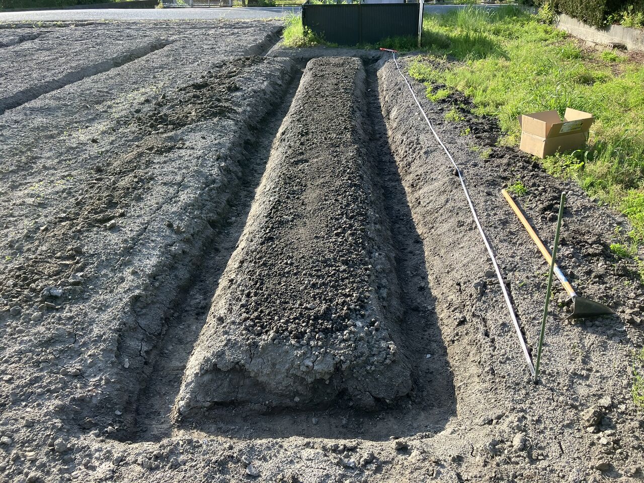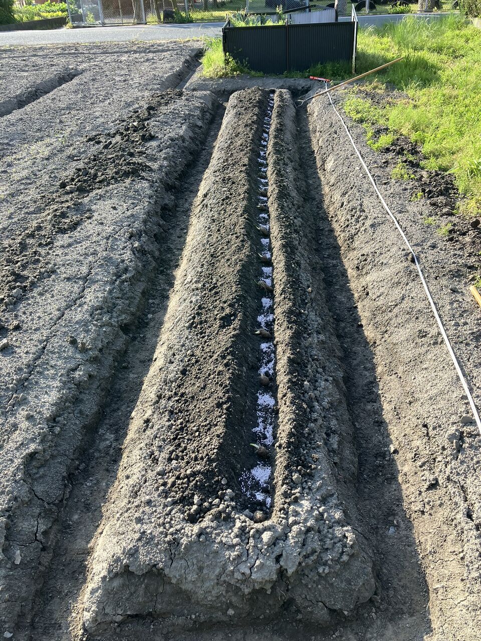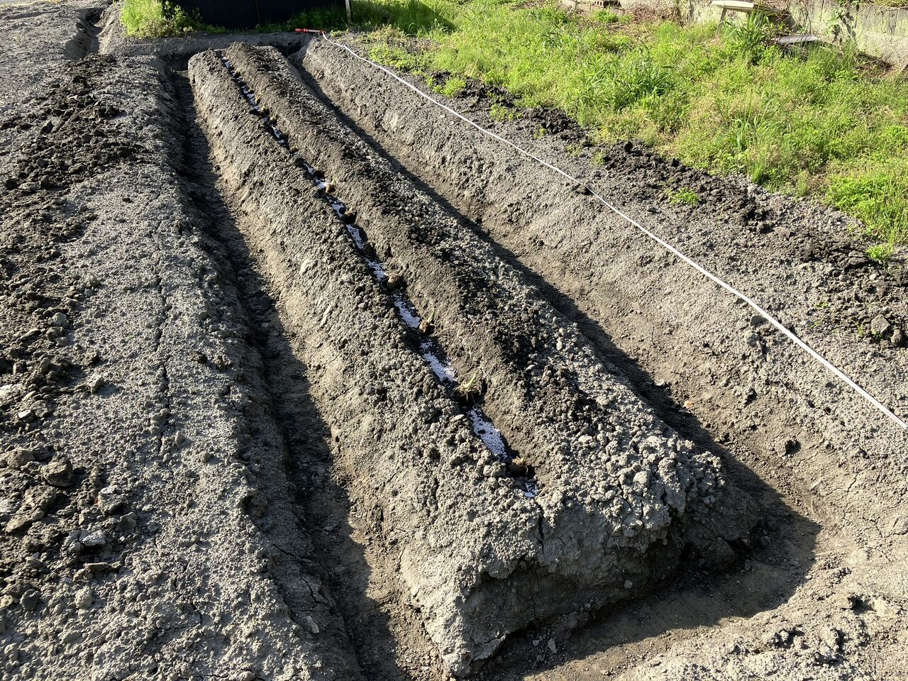 畝を立ててあった西側畑に植えました。一列ずつ溝を付けて種芋を40cm間隔に置きます。種芋の間に化成888を入れました。